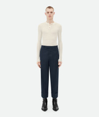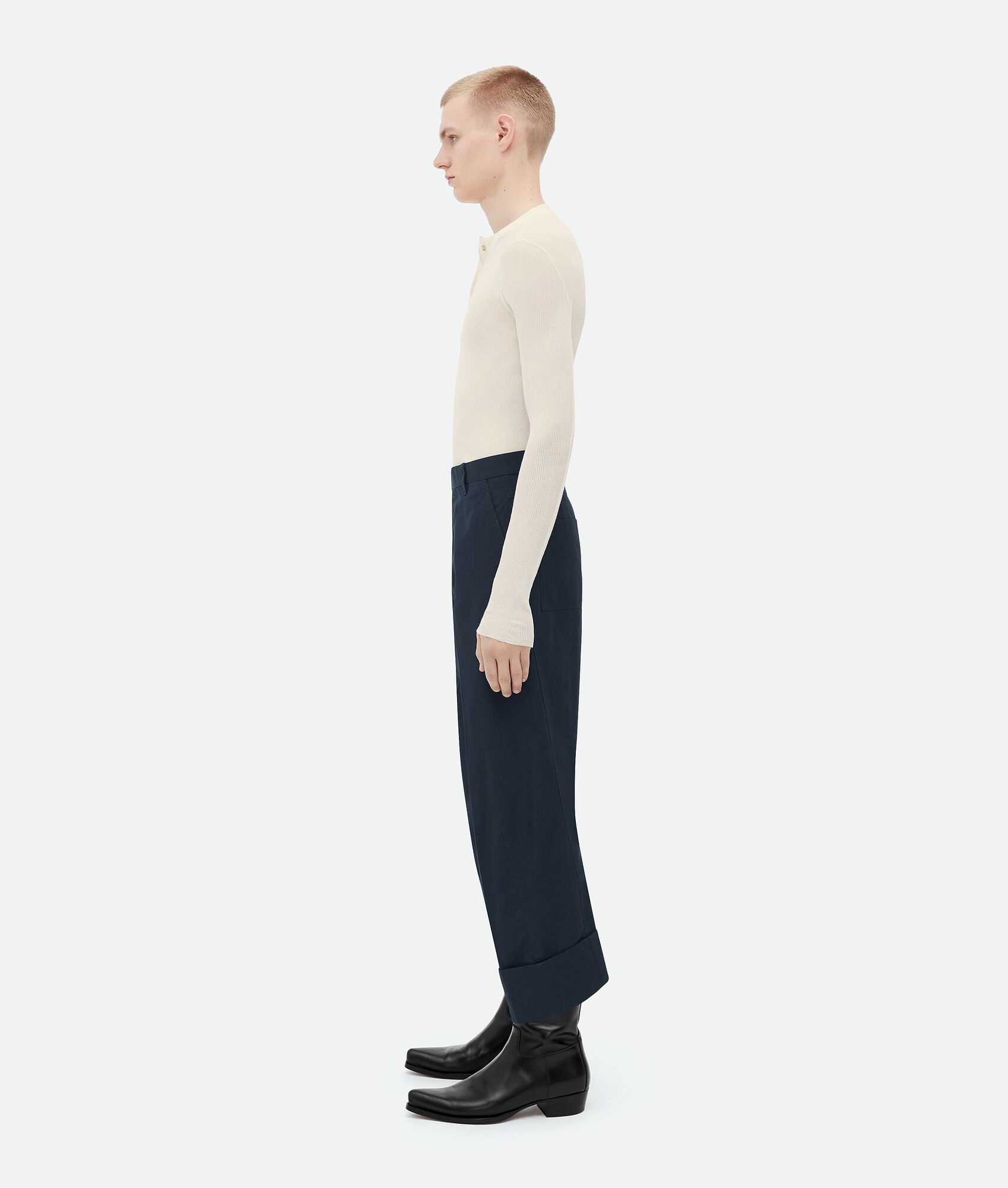 Compact cotton pants. Product details • Compact cotton pants • Turned-up lapels • Zipper and button closure Material: 100% Cotton • Color: Abyss Made in: Italy Size & fit • Model is 188 cm|6'2" and is wearing a Bottega Veneta size 46