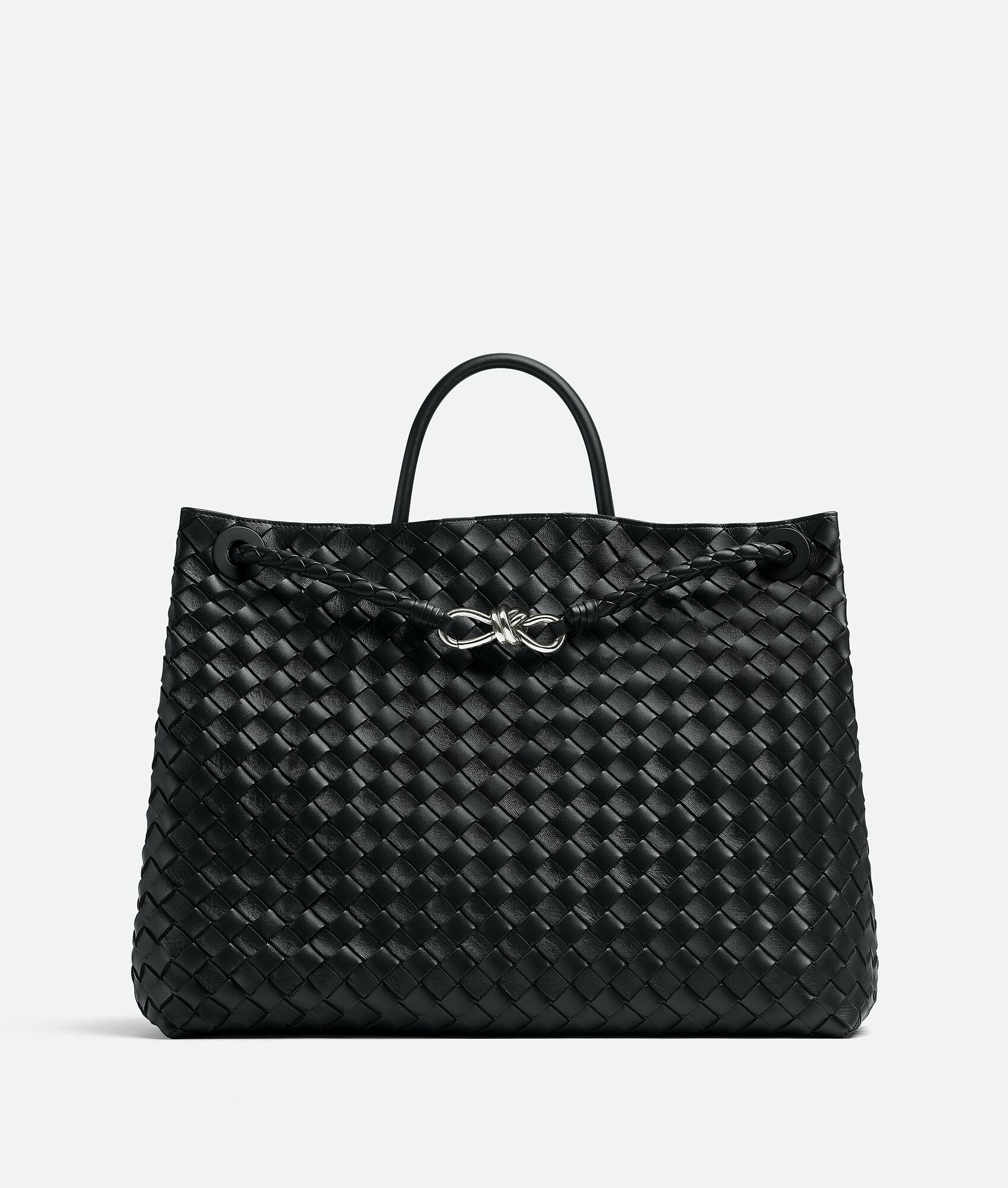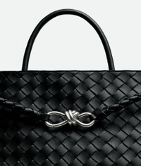 Top handle bag in supple Intrecciato leather with signature knot detail and sliding Product Details - Large Intrecciato leather top handle bag with sliding cross-body strap - Compartmented interior with one zippered pocket, two open pockets - Magnetic closure - Material: lambskin - Lining: Lambskin bonded Intrecciato - Color: Black - Hardware: Silver finish - Height: 35 cm | 13.8” - Width: 42 cm | 16.5” - Depth: 18 cm | 7.1” - Handle drop: 9 cm | 3.5” - Strap drop: 45 cm | 17.7” - Made in: Italy - Product code: 766019VCPP11249