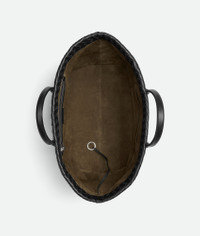 Tote bag in soft suede with Intrecciato leather detailing. Product Details - Large tote bag in suede, with Intrecciato leather detail - Two interior open pockets and one zipped pocket - Lining: Suede - Color: Kaki/Black - Hardware: Silver finish - Made in: Italy - Product code: 855510V64R03696 Material - Material: Calfskin Size & Fit - Height: 33 cm (13.0") - Width: 47 cm (18.5") - Depth: 20 cm (7.9") - Handle drop: 18 cm (7.1")