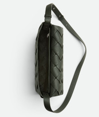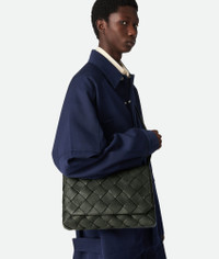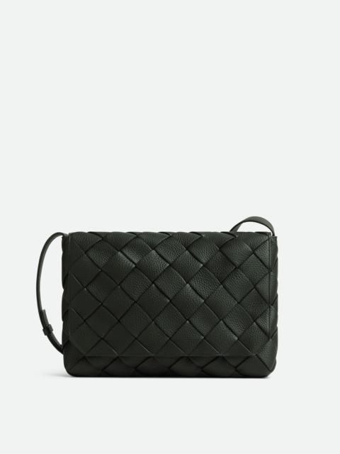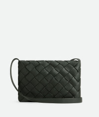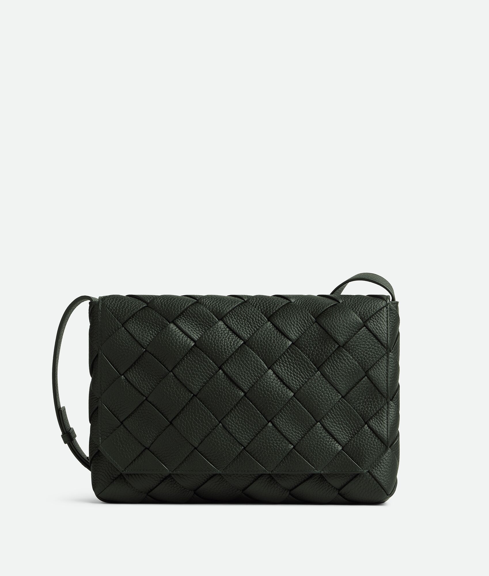 Cross-body bag in grained Intreccio leather. Product Details - Large grained Intreccio leather cross-body bag with adjustable strap - Single interior zippered pocket - Magnetic closure - Material: Calfskin - Lining: Calfskin bonded Intreccio - Color: Dark Green - Hardware: Silver finish - Height: 21.5 cm | 8.5" - Width: 32 cm | 12.6" - Depth: 5 cm | 2” - Strap drop: 46.5 cm | 18.3" - Made in: Italy - Product code: 815796V4FV13009