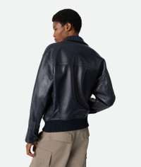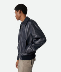 Blouson in midweight soft nappa lambskin with Intrecciato leather collar. Product Details - Midweight soft nappa lambskin blouson - Intrecciato leather collar - Zip closure - Checked lining - Regular fit - Color: Navy - Made in: Italy - Product code: 829954V64W04121 Material - Material: 100% Lambskin Size & Fit - Model is 185 cm|6'1" and is wearing a Bottega Veneta size 46