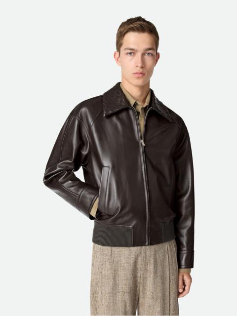 Blouson in midweight soft nappa lambskin with Intrecciato leather collar. Product Details - Midweight soft nappa lambskin blouson - Intrecciato leather collar - Zip closure - Checked lining - Regular fit - Material: 100% Lambskin - Color: Dark Forest - Made in: Italy - Product code: 829954V5BX03584 Size & Fit - Model is 192 cm|6'3" and is wearing a Bottega Veneta size 46