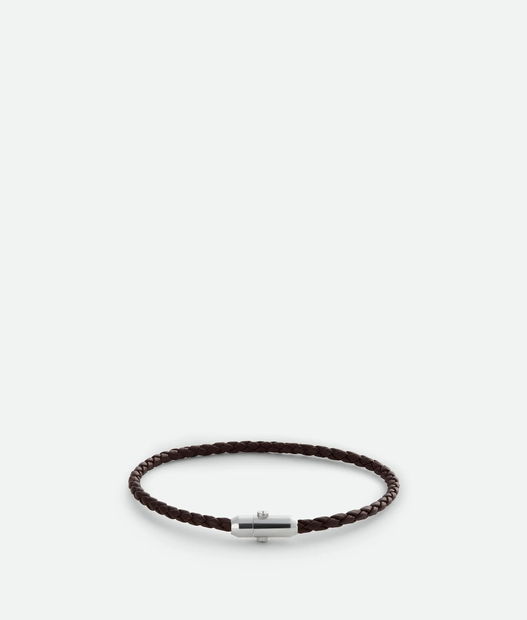 Bracelet in braided nappa leather with custom sterling silver push closure. Product Details - Braided nappa leather and sterling silver bracelet - Custom-made push button closure - Color: Fondant - Made in: Italy - Product code: 844783V507C2113 Material - Material: Lambskin, sterling silver Size & Fit - Size S: 17.5 cm | 6.9" - Size M: 19 cm | 7.5" - Size L: 20.5 cm | 8.1"