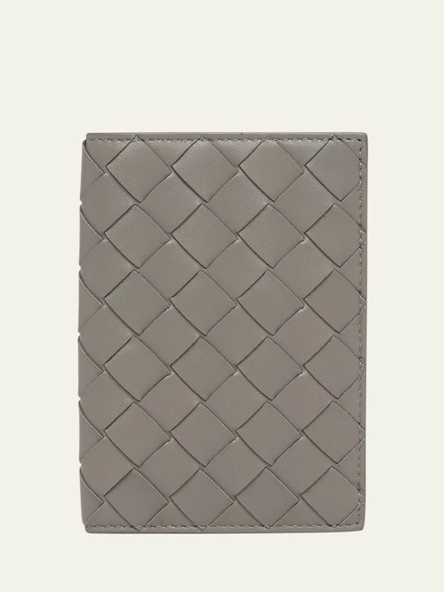 Bottega Veneta passport case in intrecciato napa leather Bifold flap construction Interior, one slip pocket, five card slots Approx. 5.2"H x 3.7"W Made in Italy