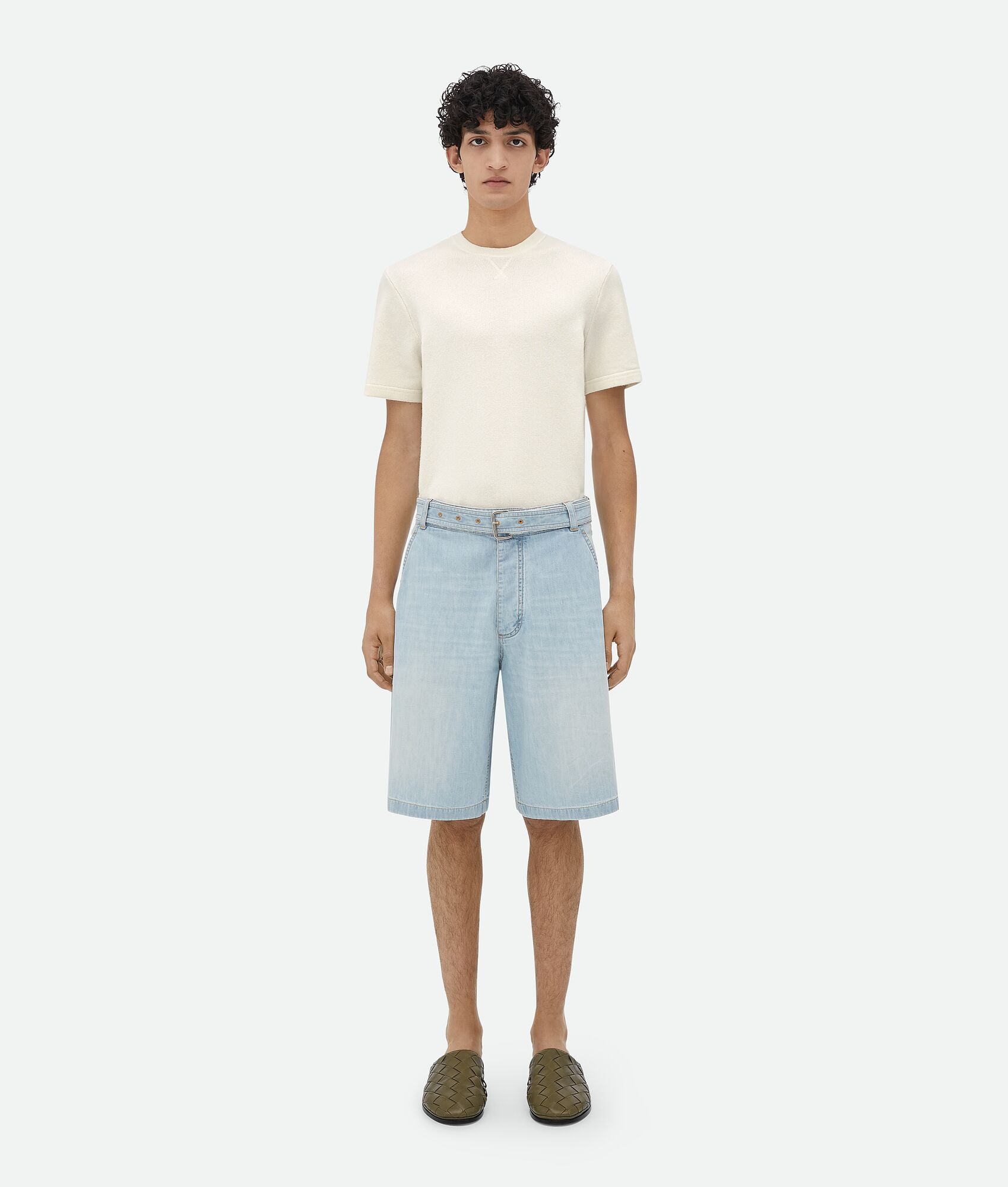 Shorts realised in soft lightweight denim with a new bleached finish. Product Details - Light bleached denim shorts - Button and belt closure - Regular fit - Material: 100% Cotton - Color: Light Bleach - Made in: Italy - Product code: 771881V3N604946 Size & Fit - Model is 189 cm|6'2" and is wearing a Bottega Veneta size 46
