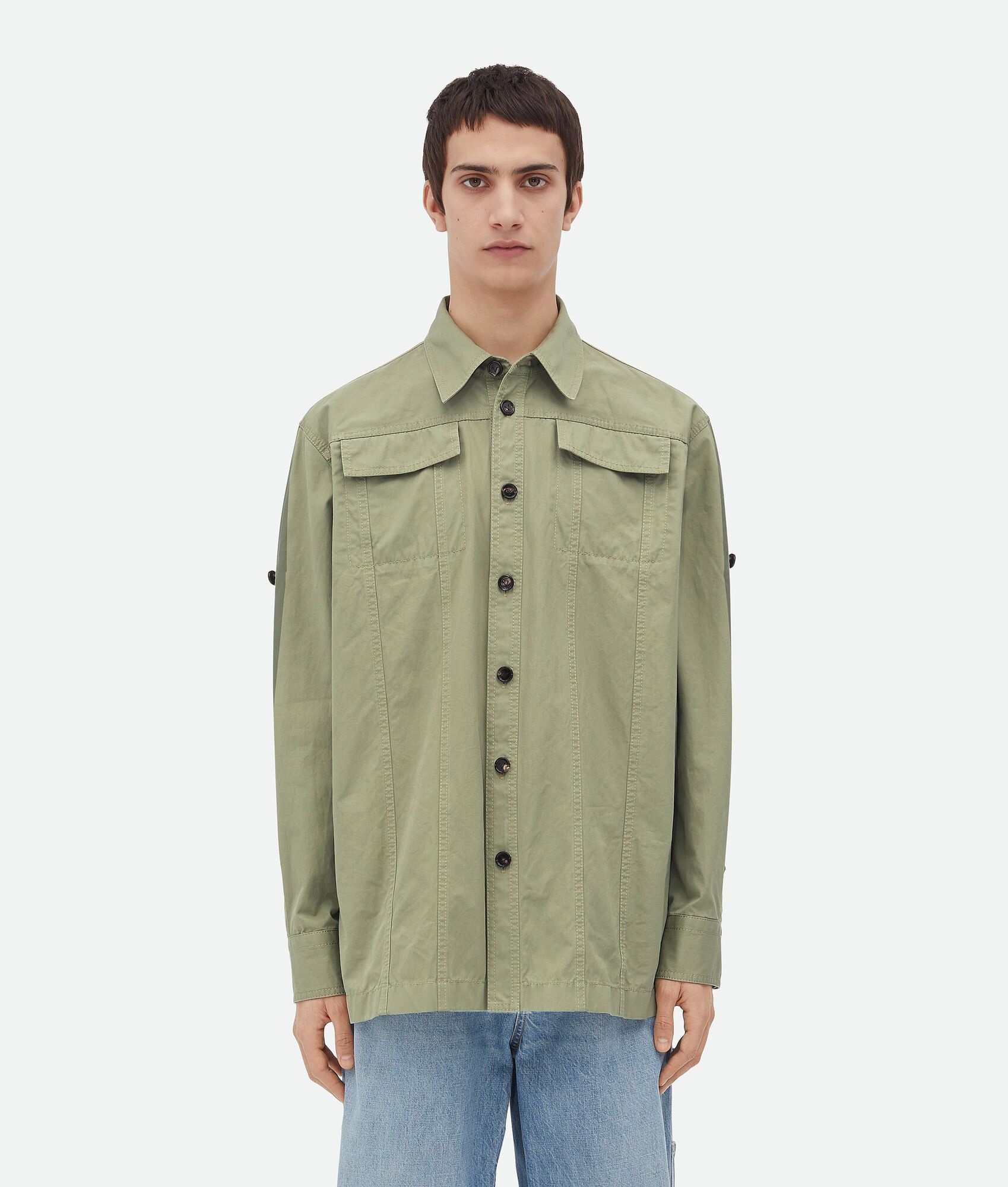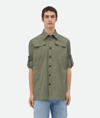Overshirt in light cotton twill. Product Details - Light cotton twill overshirt - Button closure - Unlined - Relaxed fit - Material: 100% Cotton - Color: Juniper - Made in: Italy - Product code: 793987V4CS03025 Size & Fit - Model is 188 cm|6'2" and is wearing a Bottega Veneta size 46