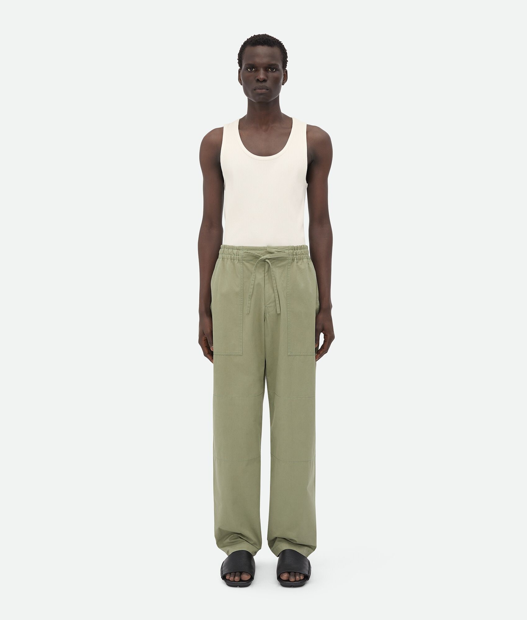 Trousers in light cotton twill. Product Details - Light cotton twill trousers - Elasticated waistband - Drawstring - Unlined - Straight leg - Material: 100% Cotton - Color: Juniper - Made in: Italy - Product code: 794140V4CS03025 Size & Fit - Model is 189 cm | 6'2" and is wearing a Bottega Veneta size S