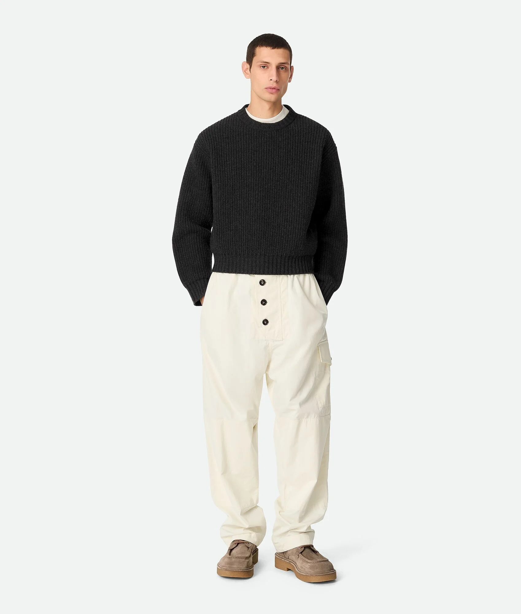 Trousers in light cotton twill. Product Details - Light cotton twill trousers - Straight leg - Elasticated waistband and button closure - Material: 100% cotton - Color: Frosting - Made in: Italy - Product code: 807487V4CS03043 Size & Fit - Model is 188 cm | 6'2" and is wearing a Bottega Veneta size S