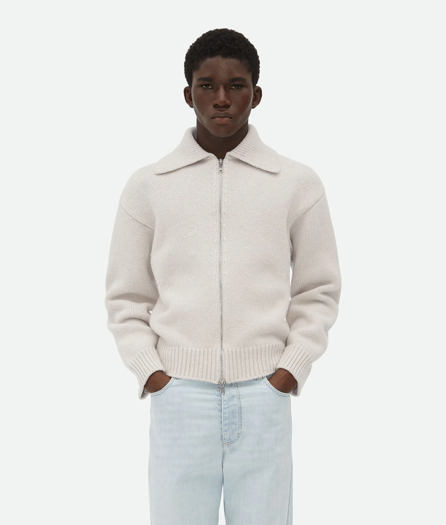 Cardigan in compact wool. Product Details - Compact wool cardigan - Zipper closure - Regular fit - Material: 100% wool - Color: Dove Melange - Made in: Italy - Product code: 809074V4VA09710 Size & Fit - Model is 190 cm | 6'2" and is wearing a Bottega Veneta size S