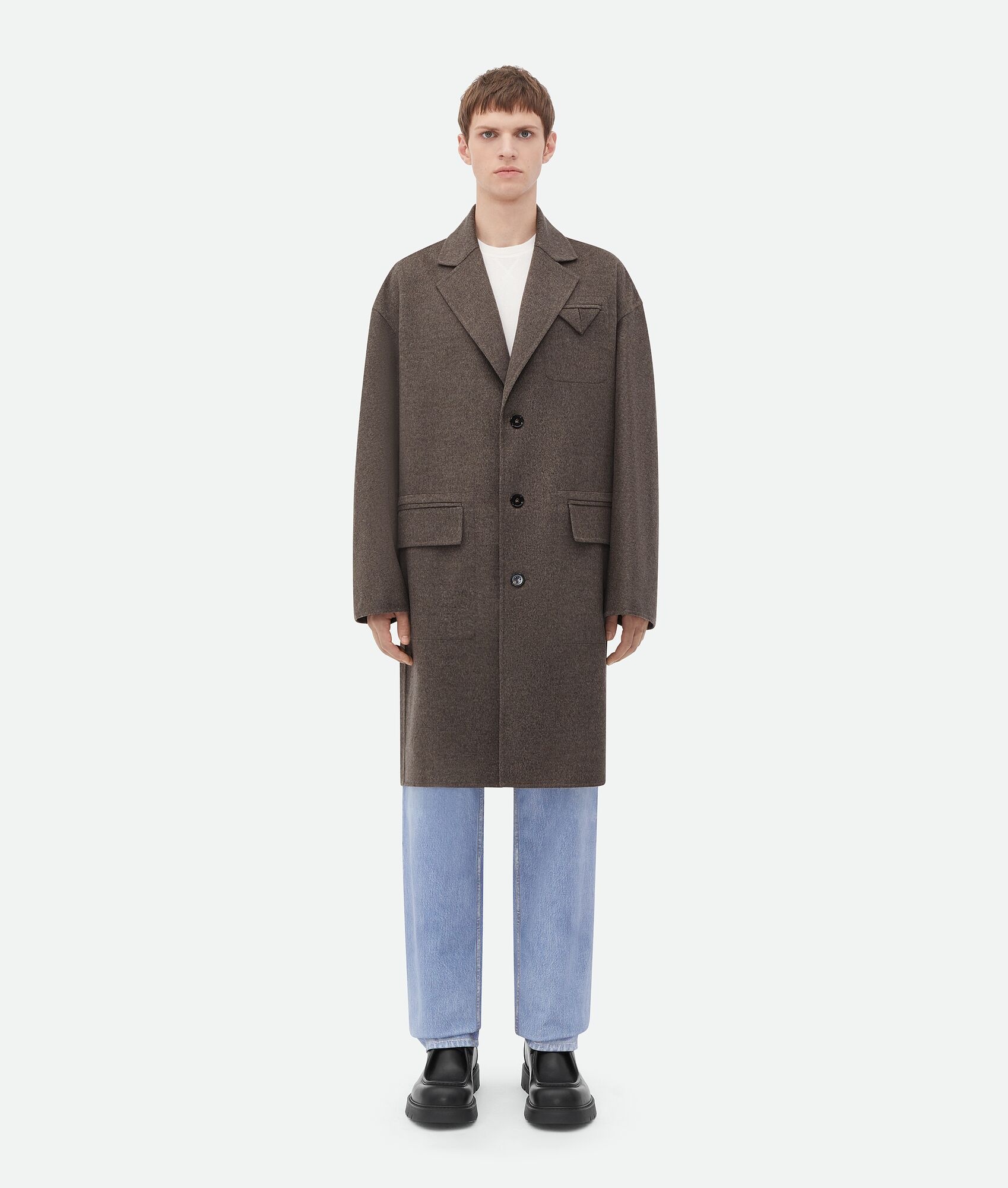 Coat with kimono silhouette realised in soft lightweight wool cashmere with a fluid Product Details - Light wool cashmere kimono coat - Button closure - Regular fit - Material: 80% Wool, 20% Cashmere - Color: Peppercorn Melange - Made in: Italy - Product code: 768988V3OO01787 Size & Fit - Model is 190 cm | 6'2" and is wearing a Bottega Veneta size 46