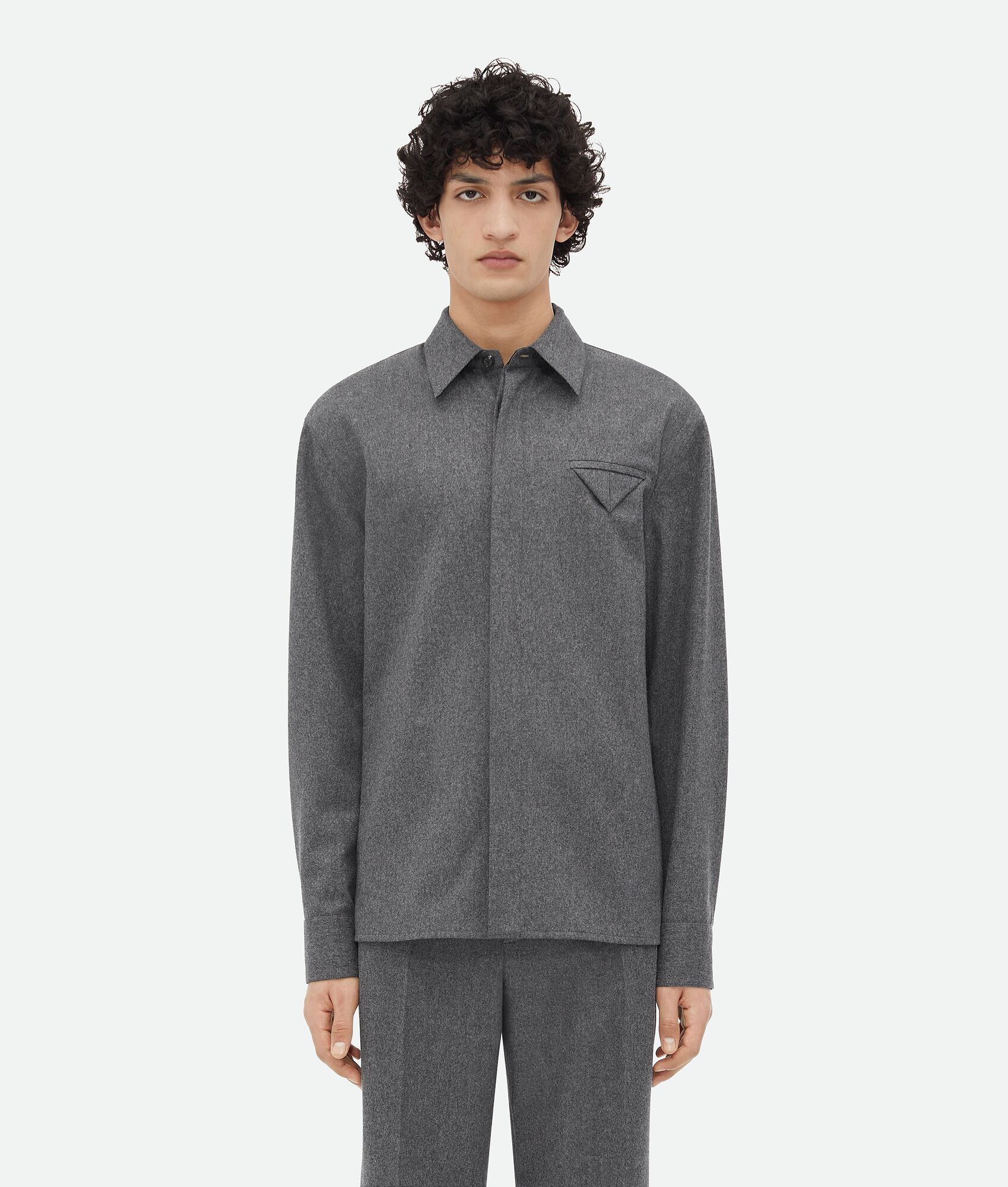 Shirt in light wool flannel. Product Details - Light wool flannel shirt - Triangle detail - Button closure - Unlined - Regular fit - Material: 100% Wool - Color: Grey Melange - Made in: Italy - Product code: 772381V4C801962 Size & Fit - Model is 189 cm|6'2" and is wearing a Bottega Veneta size 46