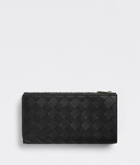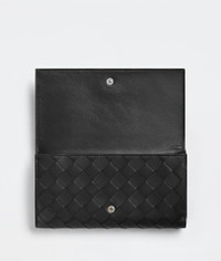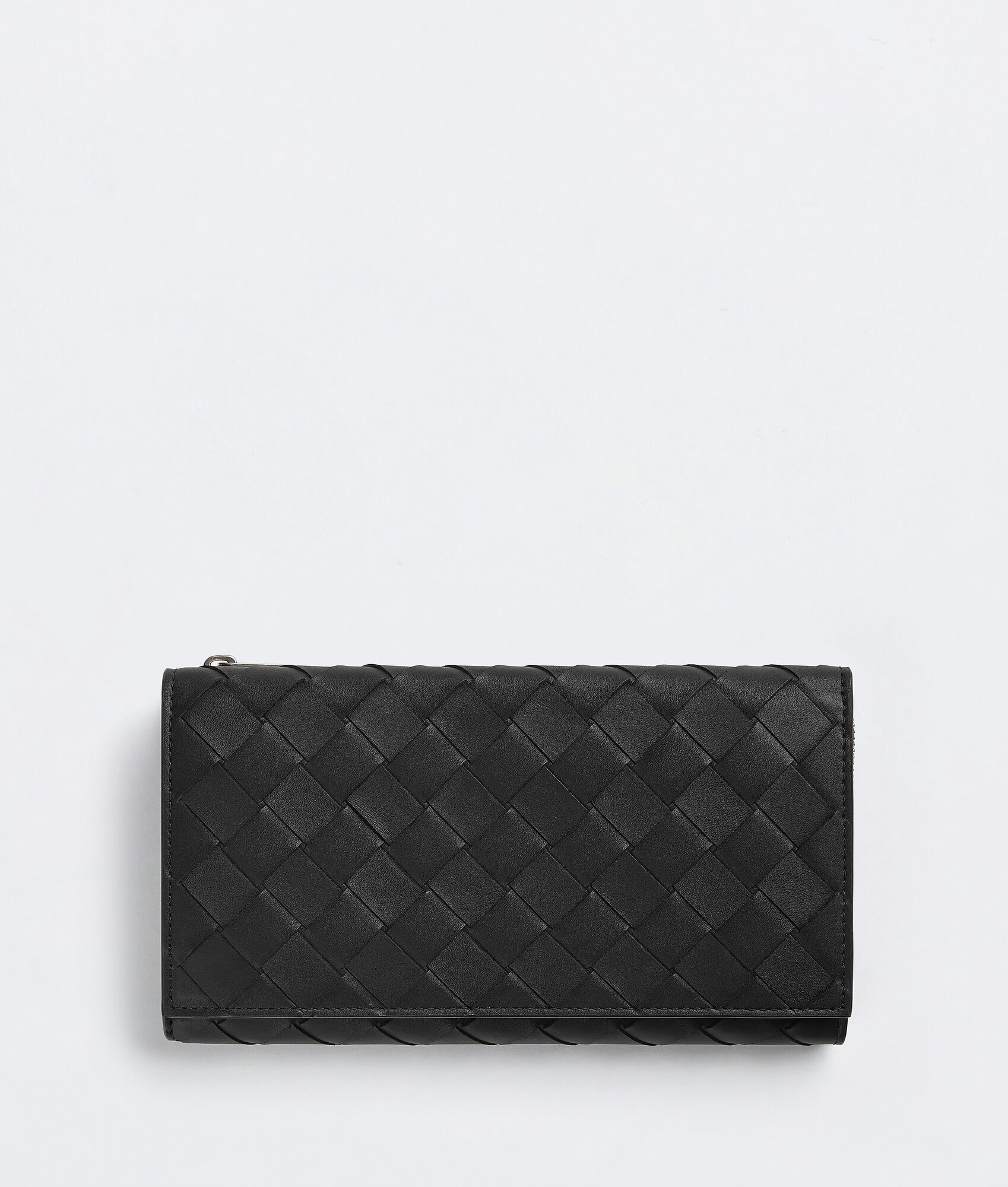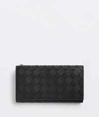 • Intrecciato leather wallet • Eight card slots, two bill compartments, two additional pockets, one zippered coin purse, one exterior flap pocket with press stud • Zipper closure Material: 100% Calfskin • Lining: Calfskin • Color: Black • Hardware: Silver finish • Height: 11 cm | 4.3" • Width: 19 cm | 7.5" • Depth: 2 cm | 0.8" Made in: italy