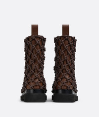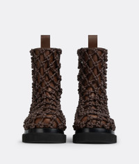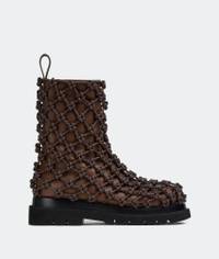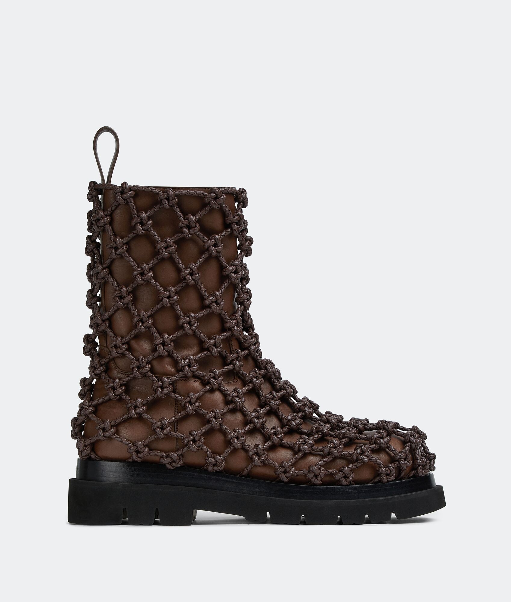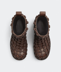 • Vegetable-tanned leather boots • Hand-knotted intreccio leather netting Material: 100% Calfskin • Lining: Calfskin • Color: Dark Chestnut • Micro rubber outsole • Flatform: 5.5 cm | 2.1" • We recommend to take half a size down Made in: Italy