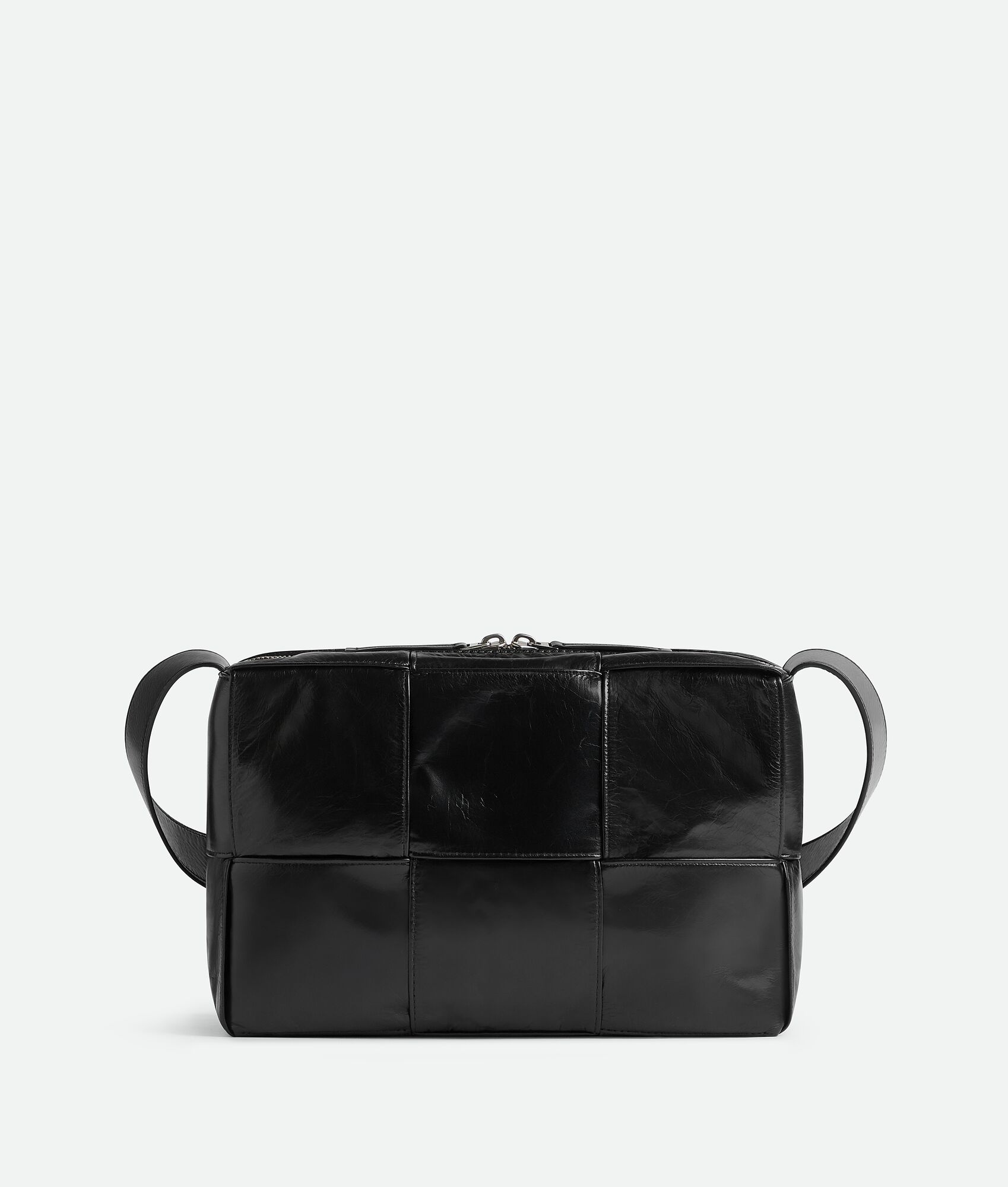Camera bag in soft Intreccio leather. Product Details - Medium Intreccio soft leather camera bag - One interior zipped pocket - Zip closure - Material: Calfskin - Lining: Suede bonded Intreccio - Colour: Black - Hardware: Silver finish - Height: 18 cm | 7.1" - Width: 28 cm | 11" - Depth: 9 cm | 3.5" - Strap drop: 50 cm | 19.7" - Made in: Italy - Product code: 731165VCQ718803