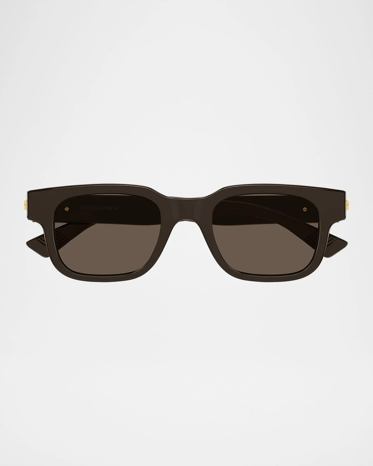 The "Bv1411s003" rectangular sunglasses by Bottega Veneta showcase the signature goldfinished ribbon on the temples Lens/bridge/temple (in mm): 5318140 Solidcolor lenses Saddle nose bridge Plastic 100% UVA/UVB protection Made in Italy