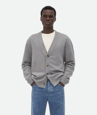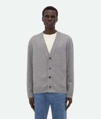 Cardigan in classic cashmere with signature Intrecciato leather patches. Product Details - Classic cashmere cardigan - Intrecciato leather patches detail - Button closure - Relaxed fit - Material: 97% Cashmere, 2% Polyamide, 1% Elastane - Color: Light Grey Melange - Made in: Italy - Product code: 777588V2MM08531