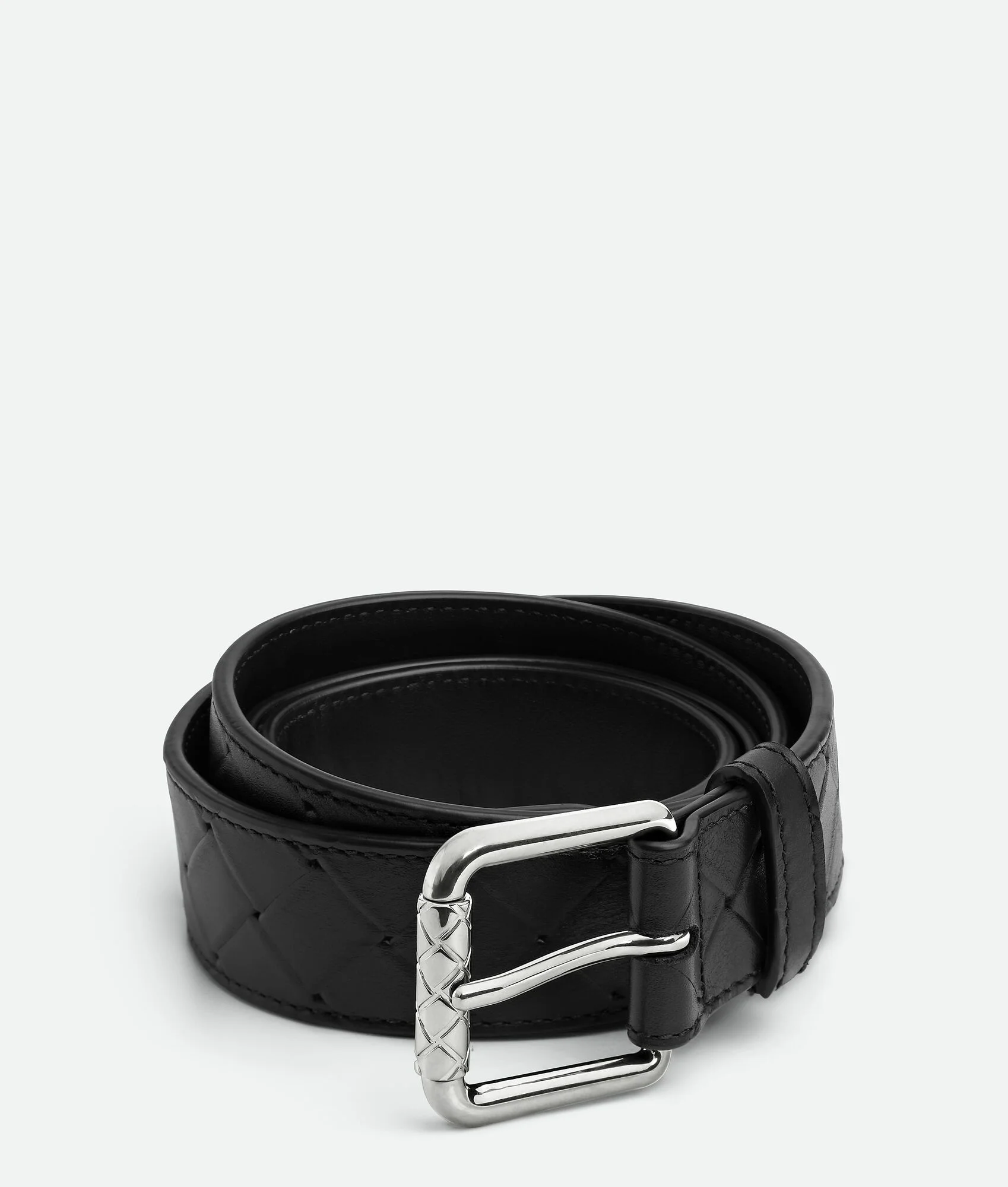 Belt in calf leather with embossed Intrecciato pattern. Product Details - Intrecciato embossed calf leather belt - Metal roller buckle - Prong closure - Lining: Calf leather - Color: Black - Hardware: Silver finish - Height: 3 cm | 1.2" - Depth: 0.5 cm | 0.2" - Made in: Italy - Product code: 837724V0AQ18803