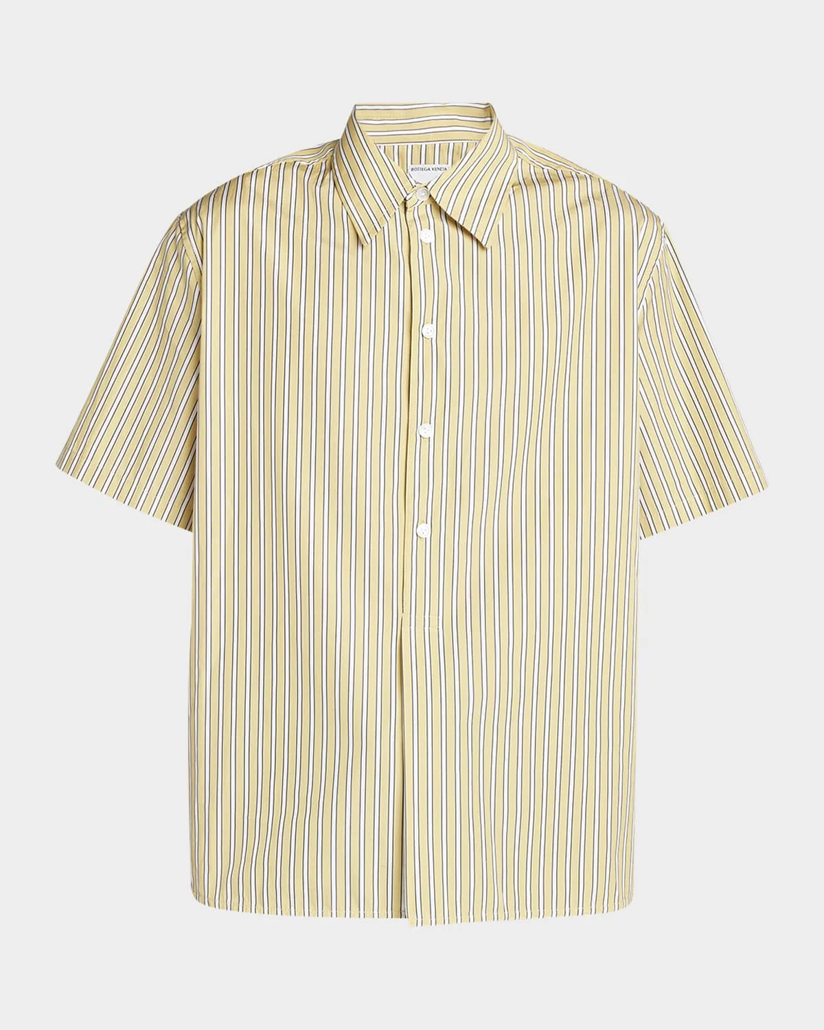 - Bottega Veneta poplin shirt in outlined stripes - Point collar - Button placket - Short sleeves - Relaxed fit - Side pleats at back yoke - Notched hem - Cotton - Made in Italy - Model is 6'1"/185cm.