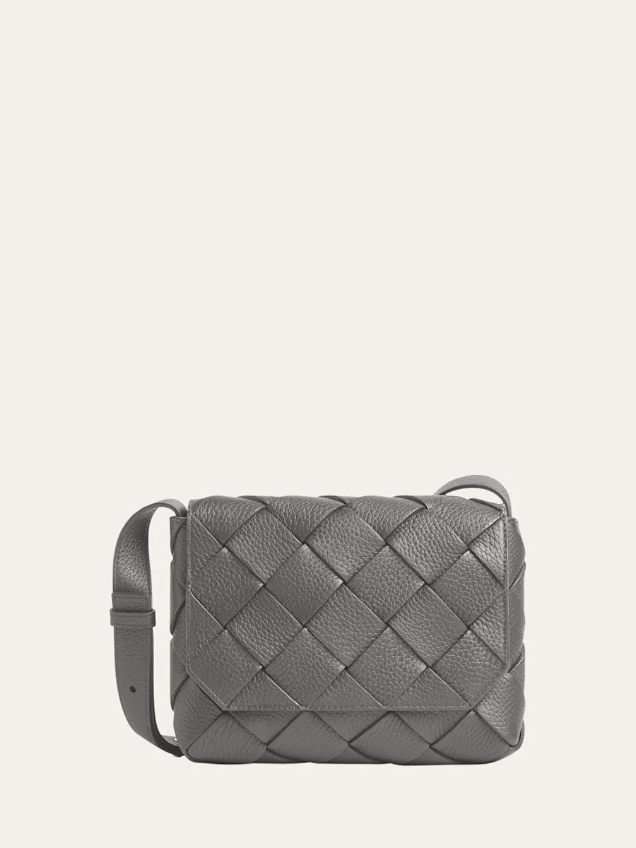 Bottega Veneta messenger bag in grained Intreccio leather Adjustable crossbody strap Flap top Magnetic closure Interior, one zip pocket Approx. 6.5"H x 8.9"W x 2.16"D Made in Italy