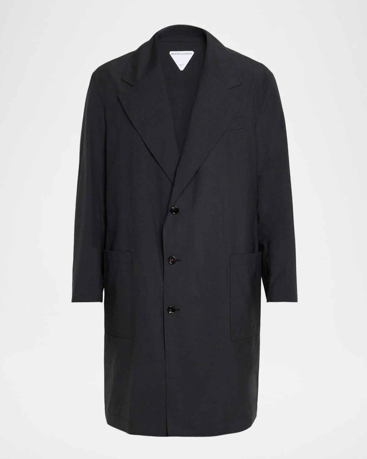 - Bottega Veneta overcoat in superfine wool for a sleek and luxurious finish - Notched lapels - Single-breasted front - Chest welt pocket - Hip patch pockets - Long sleeves - Single-vented back - Knee length - Wool - Lining: Cotton/viscose - Made in Italy