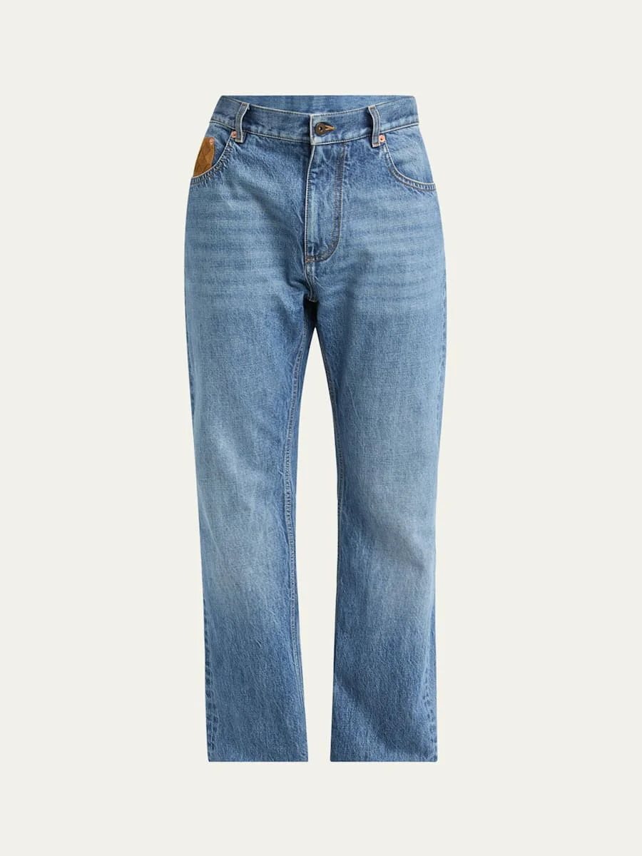 Bottega Veneta jeans in vintage washed denim, highlighted with a suede Intrecciato ticket pocket Regular rise Five-pocket style Relaxed fit through straight legs Cuffed hem Button-zip front; belt loops Cotton Made in Italy Online Inquiries: BGS21_NDT78| Store Inquiries: #5080431