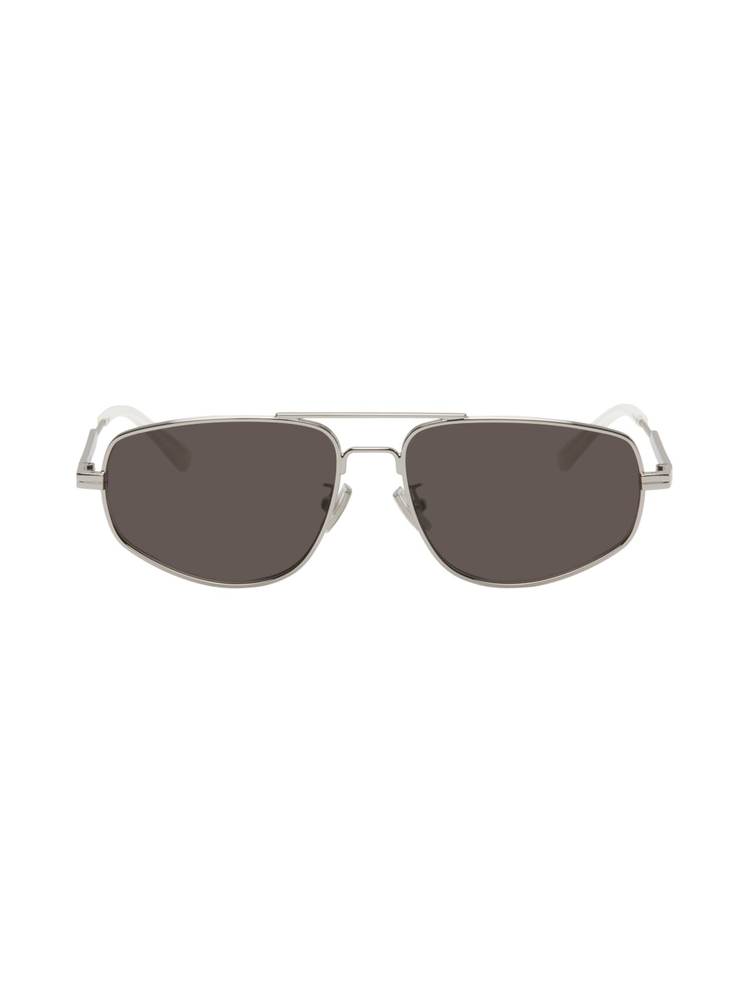 Aviator-style metal-frame sunglasses in silver tone. · Gray lenses · Adjustable rubber nose pads · Top bar · Logo etched at temples · Rubberized temple tips · Includes case · Size: 59.16 140 Supplier color: Silver/Silver/Grey