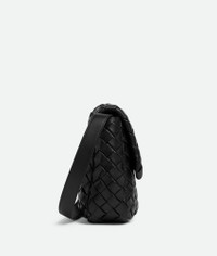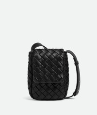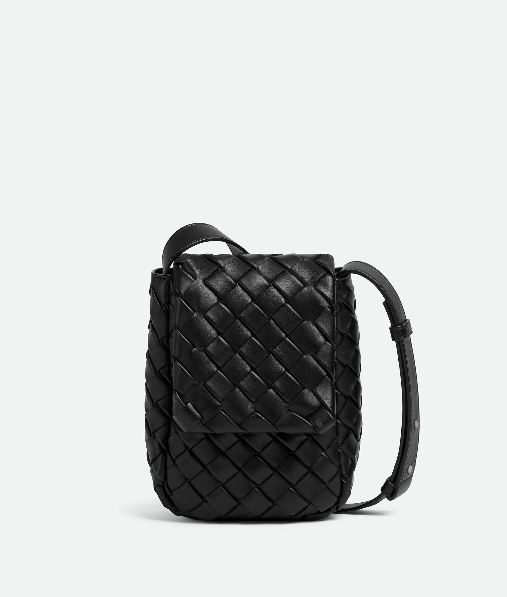 Vertical cross-body bag crafted in padded Intrecciato nappa leather with an adjustable Product Details - Mini vertical padded Intrecciato leather cross-body bag with adjustable strap - Single interior flat open pocket - Magnetic closure - Material: Calfskin - Lining: Canvas - Color: Black - Hardware: Silver finish - Height: 20 cm | 7.9" - Width: 16 cm | 6.3" - Depth: 10.5 cm | 4.1" - Strap drop: 50 cm | 19.7" - Made in: Italy - Product code: 776209V3BD18803