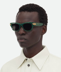 Square sunglasses made with Eastman Acetate Renew, an acetate with 27% recycled content. Product Details - Lenses made from polyamide with 39% bio-based content - Alternative fit available - BV1323SK 003 - Material: Eastman Acetate Renew, including 27% recycled material - Color: Green - Made in: Japan - Product code: 799396V2Q303344