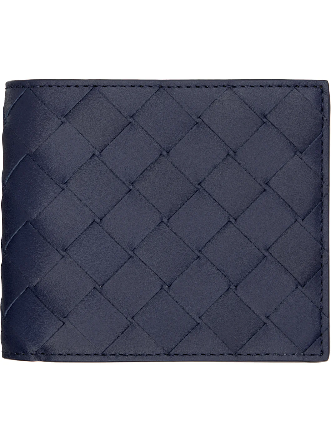 Intrecciato-woven grained calfskin bifold wallet. · Eight card slots and two note slots · Two patch pockets · Textile and calfskin lining in green · H3.75" x W4.25" Supplier color: Abyss/cypress Calfskin. Made in Italy 252798M164010