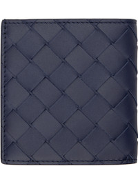 Intrecciato-woven grained calfskin bifold wallet. · Six card slots and single note slot · Two patch pockets · Textile and calfskin lining in green · H4" x W3.75" Supplier color: Abyss/cypress Calfskin. Made in Italy 252798M164009