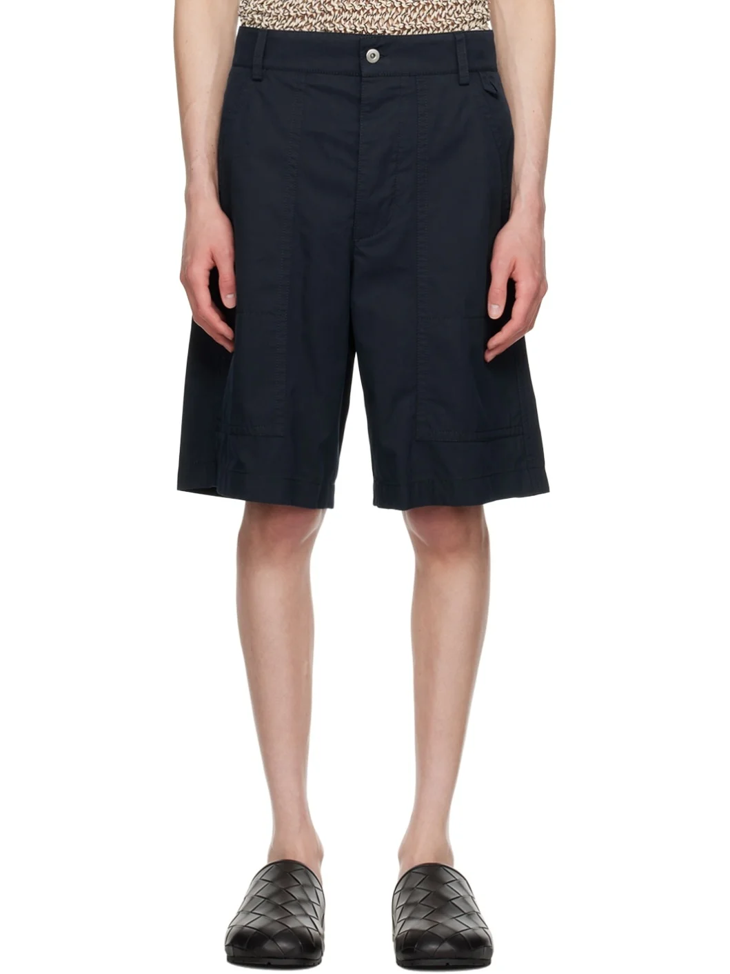 Lightweight cotton twill shorts. · Belt loops · Four-pocket styling · Button-fly · Cinch tab at back · Logo patch at back pocket Supplier color: Midnight blue 100% cotton. Made in Italy 242798M193001