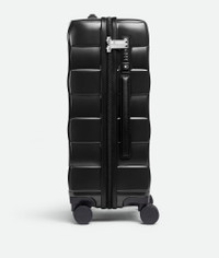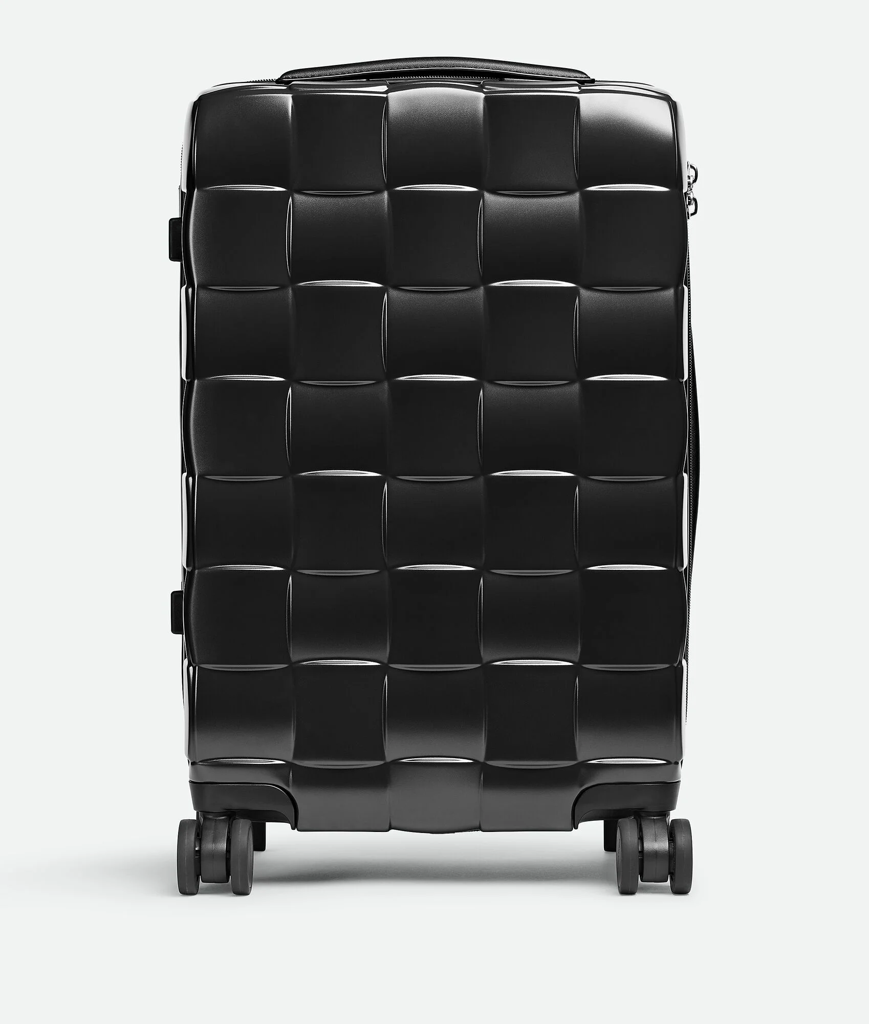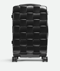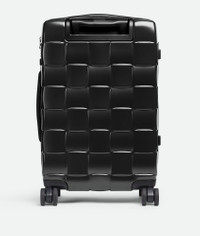 Suitcase realised in lightweight polycarbonate with 3D Intreccio pattern, featuring Product Details - Polycarbonate trolley with thermoformed Intreccio pattern - Cabin size - Volume: 38L - Calf leather handles and trims - Detachable Intrecciato leather tag holder - One zipped compartment and one strapped compartment featuring a detachable divider with a flat zipped pocket - Zip closure with TSA compliant lock system - Four 360° wheels and telescopic handle - Material: polycarbonate, calfskin - Lining: Nylon - Color: Black - Hardware: Silver finish - Height: 55cm - Width: 35 cm | 13.8” - Depth: 21 cm | 8.3” - Weight: 3.2 kg - Made in: Italy - Product code: 822479V5AO18803