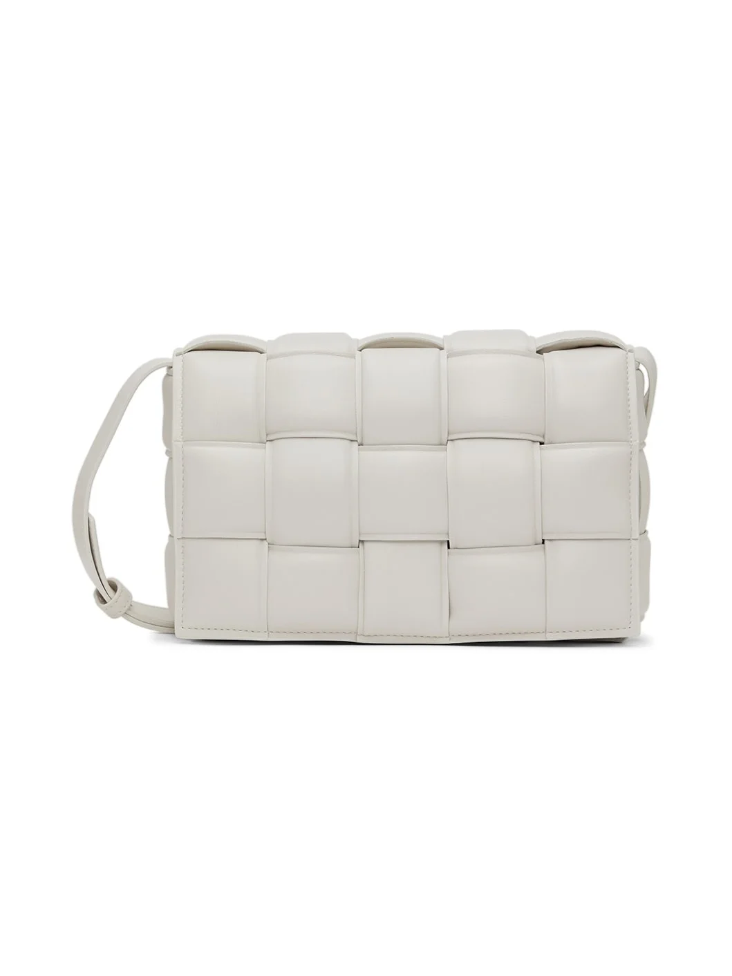 Handwoven padded intreccio-woven lambskin messenger bag in off-white. · Adjustable shoulder strap · Foldover flap with clasp fastening at main compartment · Zip pocket at interior · Gold-tone hardware · H7.1 x W10.2 x D3.1 in Supplier color: Chalk Lambskin. Made in Italy 221798M170068