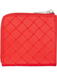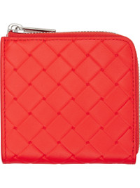 Intrecciato-embossed grained calfskin wallet. · Zip closure · Six card slots · Coin compartment · Textile and calfskin lining · H4" x W4" Supplier color: Cherry tomato Calfskin. Made in Italy 252798M164003