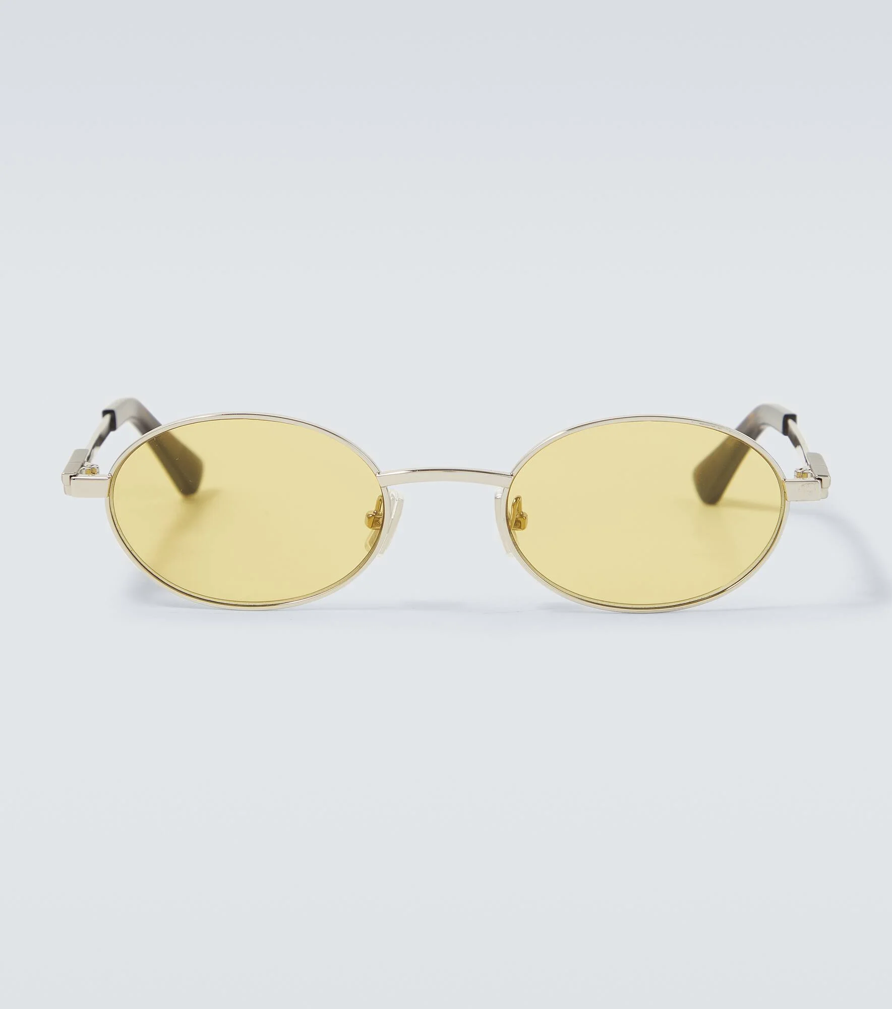 Bottega Veneta has been inspiring individuality with innovative craftsmanship since 1966. These modern sunglasses feature a lightweight metal frame, an oval shape, and silver-toned hardware at the temples. Product Details - Frame material: metal - Frame color: silver - Lens filter category 1 - Color: silver - Lens color: yellow - Made in Italy - Includes: case and presentation box, cleaning cloth - The color of the case may vary - Item number: P01145547 Size & Fit - Lens width: 52mm-2.05" - Bridge size: 21mm-0.85" - Earpiece length: 140mm-5.5"