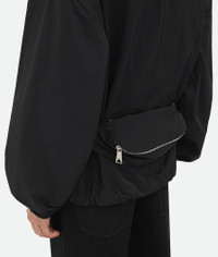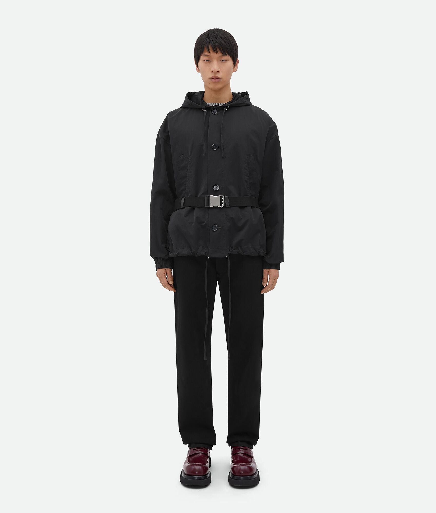 Tech nylon hooded jacket. Product details • Tech nylon hooded jacket • Travel-friendly belt bag • Button closure • Unlined • Regular fit Material: 100% Polyamide • Color: Black Made in: Italy Size & fit • Model is 186 cm|6'1" and is wearing a Bottega Veneta size S