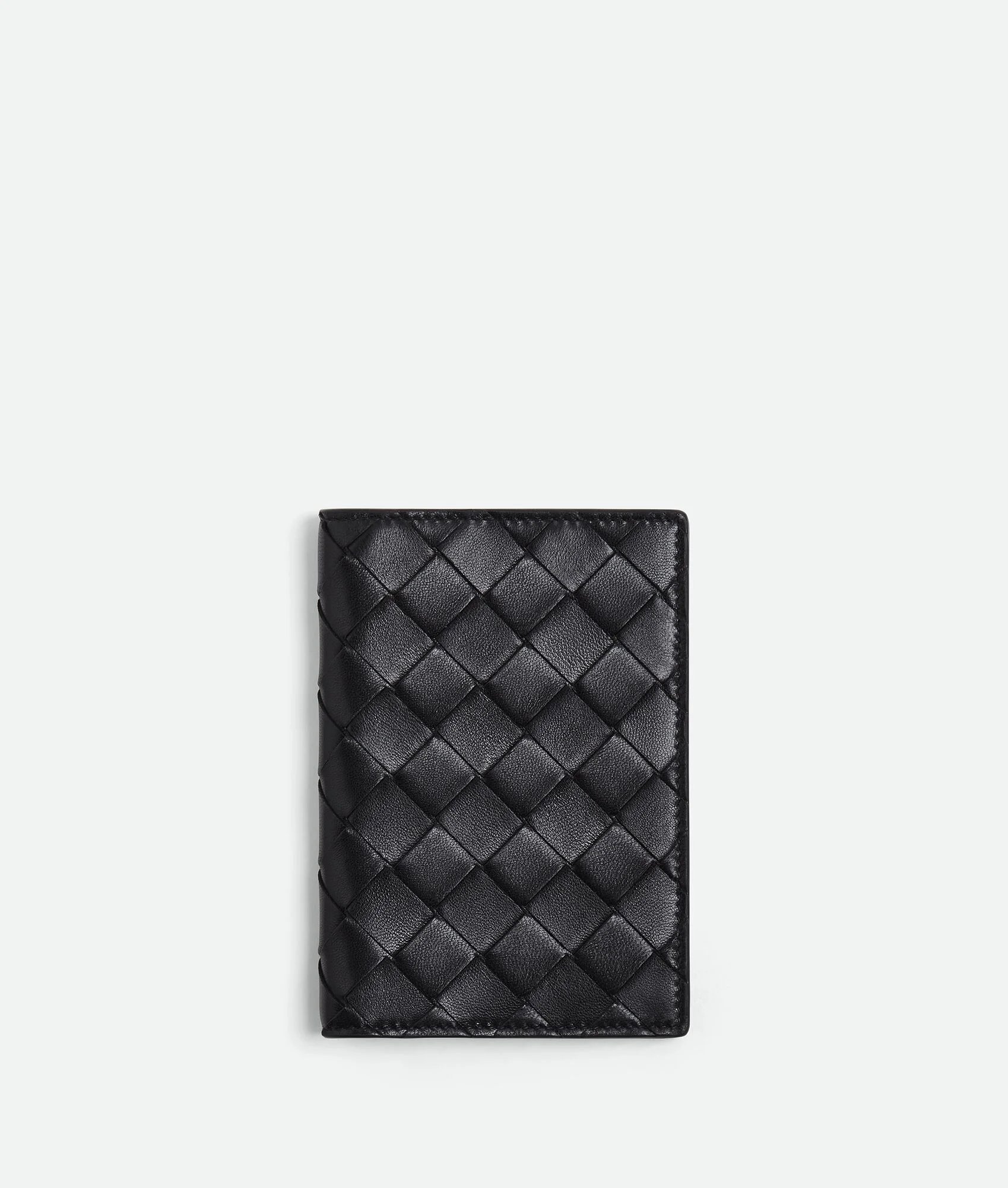 Intrecciato leather passport case. Product details • Intrecciato leather passport case • Five card slots, two additional pockets Material: 100% Lambskin • Lining: Calfskin • Color: Black • Height: 13.5 cm • Depth: 9.5 cm Made in: Italy