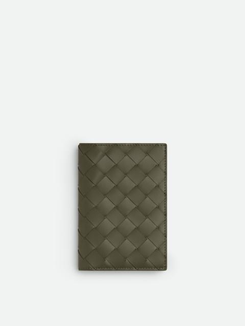 Intrecciato leather passport holder. Product details • Intrecciato leather passport holderGold • Four card slots, two additional pockets Material: 100% Calfskin • Lining: Calfskin • Color: Black/Grass • Height: 14cm • Width: 9cm • Depth: 0.5cm Made in: Italy