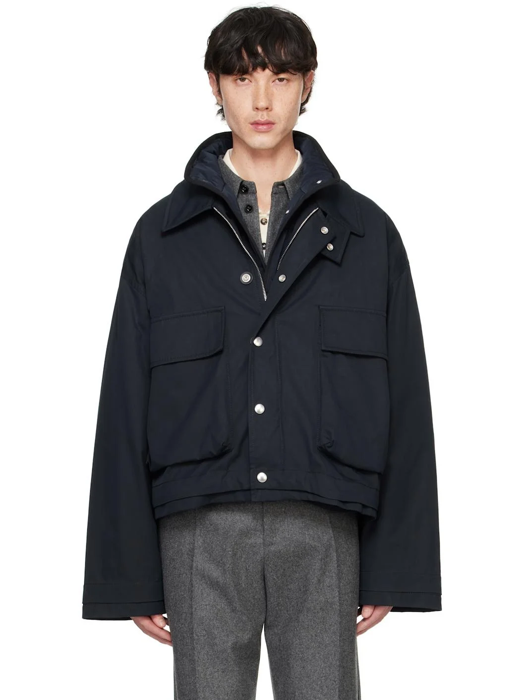 Lightweight cotton twill jacket. · Press-stud tab at spread collar · Press-stud closure · Flap and welt pockets · Layered hem and cuffs · Detachable padded and quilted nylon taffeta liner Supplier color: Midnight blue Body: 100% cotton. Fill: 100% polyester. Lining: 100% polyamide. Made in Italy 242798M180004