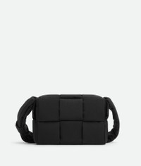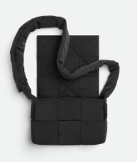 Cross-body bag made from lightweight padded nylon using Intreccio craftsmanship. Product Details - Small padded Intreccio nylon cross-body bag - Single interior zip pocket - Magnetic closure - Material: Polyamide - Unlined - Color: Black - Hardware: Silver finish - Height: 14 cm | 5.5" - Width: 23 cm | 9.1" - Depth: 7.5 cm | 3" - Strap drop: 50 cm | 20" - Made in: Italy - Product code: 755182VBO818803