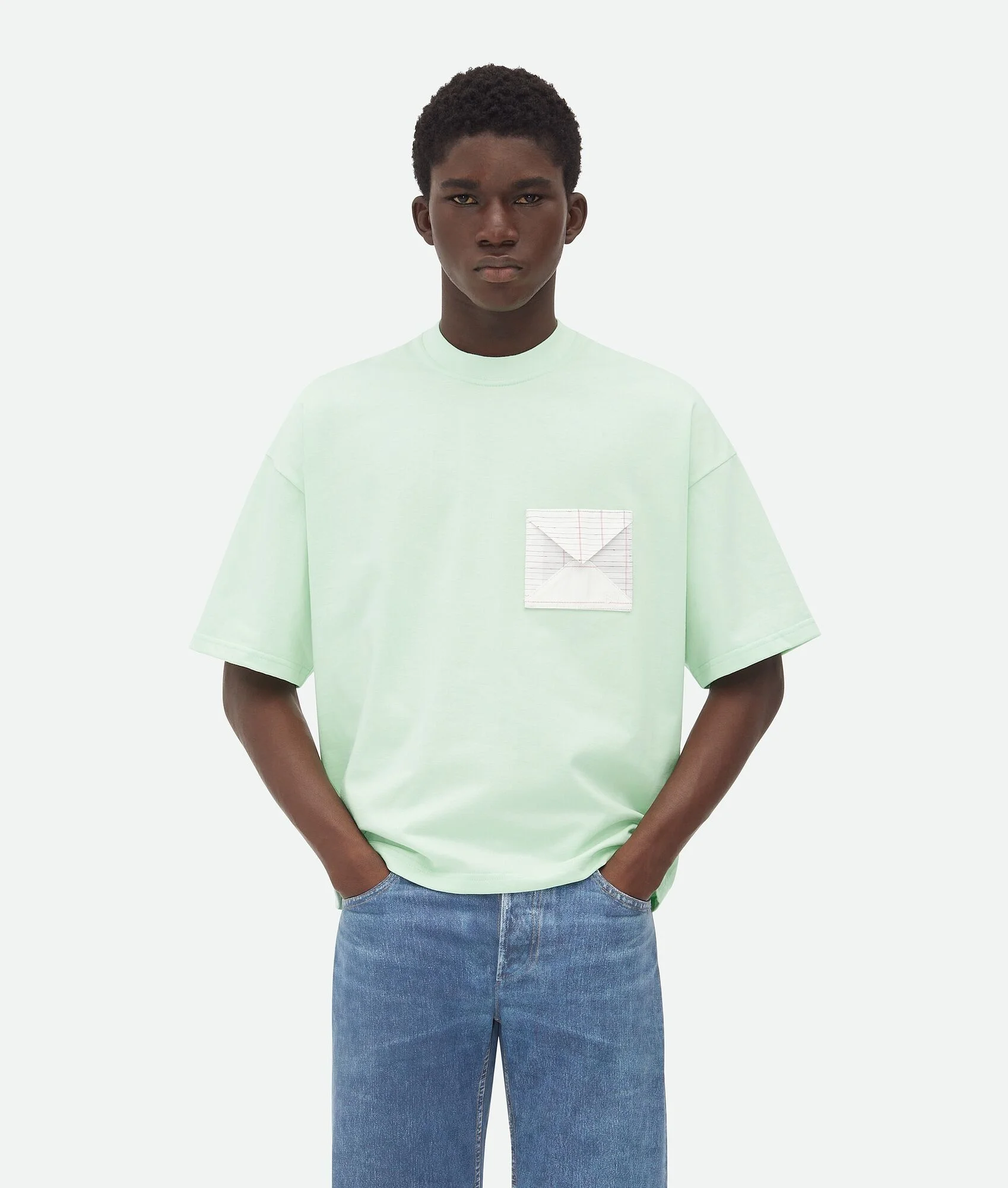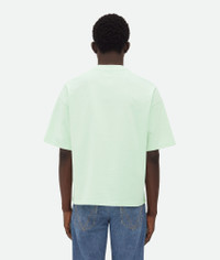 Oversized t-shirt in pima cotton jersey with notebook detail. Product Details - Pima cotton jersey T-shirt - Notebook detail - Oversized fit - Material: 100% cotton - Color: Dewdrop - Made in: Italy - Product code: 804276V4N503912 Size & Fit - Model is 190 cm | 6'2" and is wearing a Bottega Veneta size S