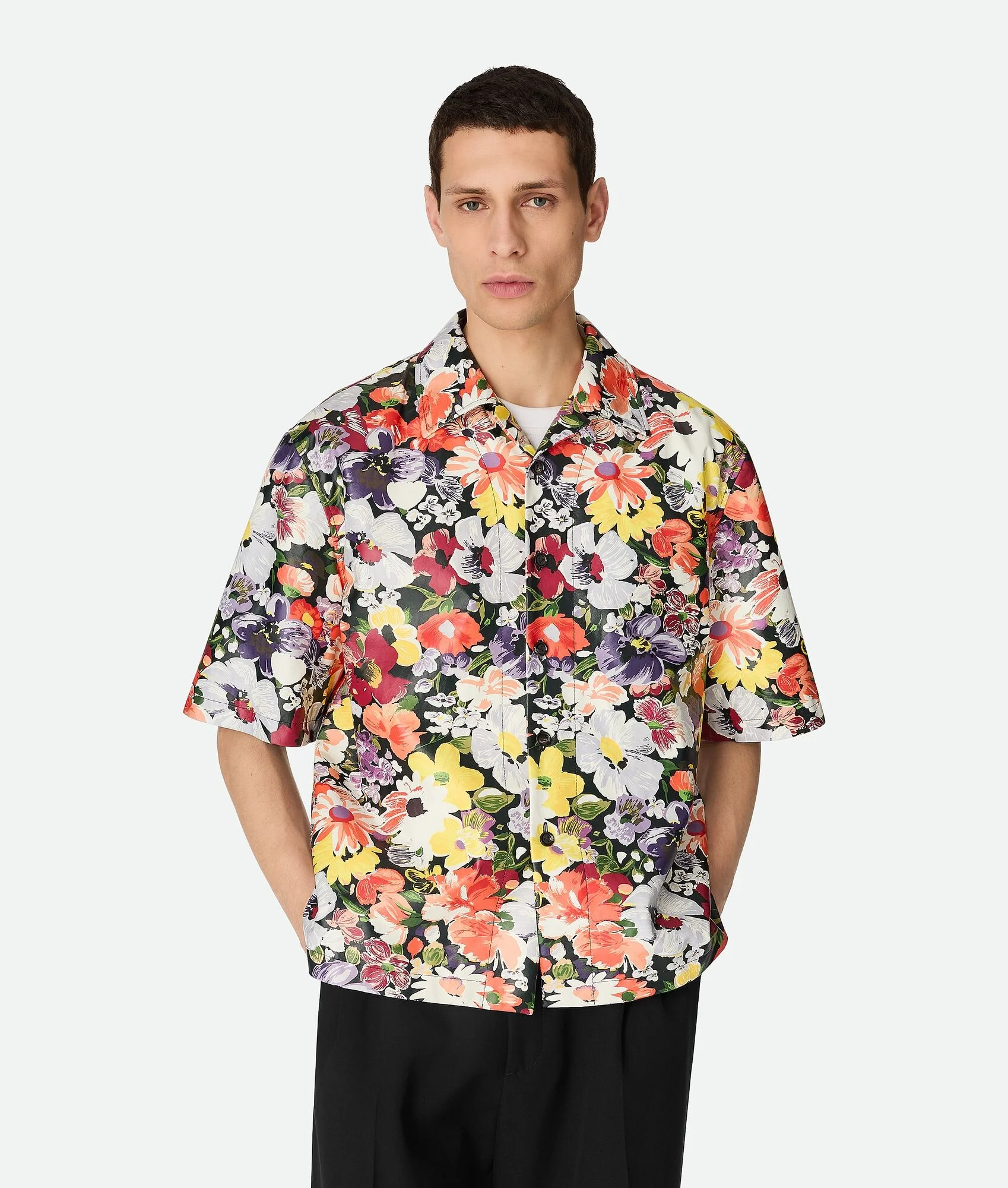 Shirt in soft leather with all-over floral print. Product Details - Multi-floral printed leather shirt - Button closure - Lined - Regular fit - Color: Multicolor - Made in: Italy - Product code: 837140V5SD08383 Size & Fit - Model is 188 cm|6'2" and is wearing a Bottega Veneta size 46
