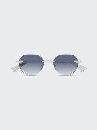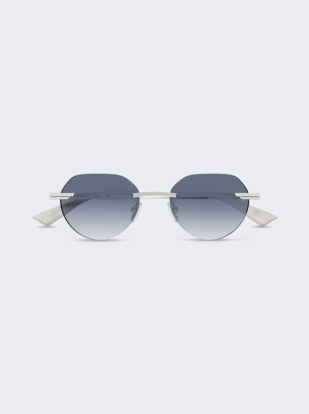 Details - Rimless round shaped sunglasses - Bio nylon gradient blue lenses - Silver tone metal nose bride and arms - 100% UVA/UVB protection - Lens/bridge/temple (in mm): 51-19-145 Vendor Color Code: Brand Style: BV1379S-004 Designer/Brand: BOTTEGA VENETA
