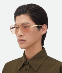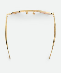 Aviator sunglasses in metal with sculptural sardine shape temples. Product Details - Temples with signature Sardine shape - Lenses made from polyamide with 39% bio-based content - BV1305S 002 - Color: Gold/Brown - Made in: Japan - Product code: 779517V44501251 Material - Material: Metal