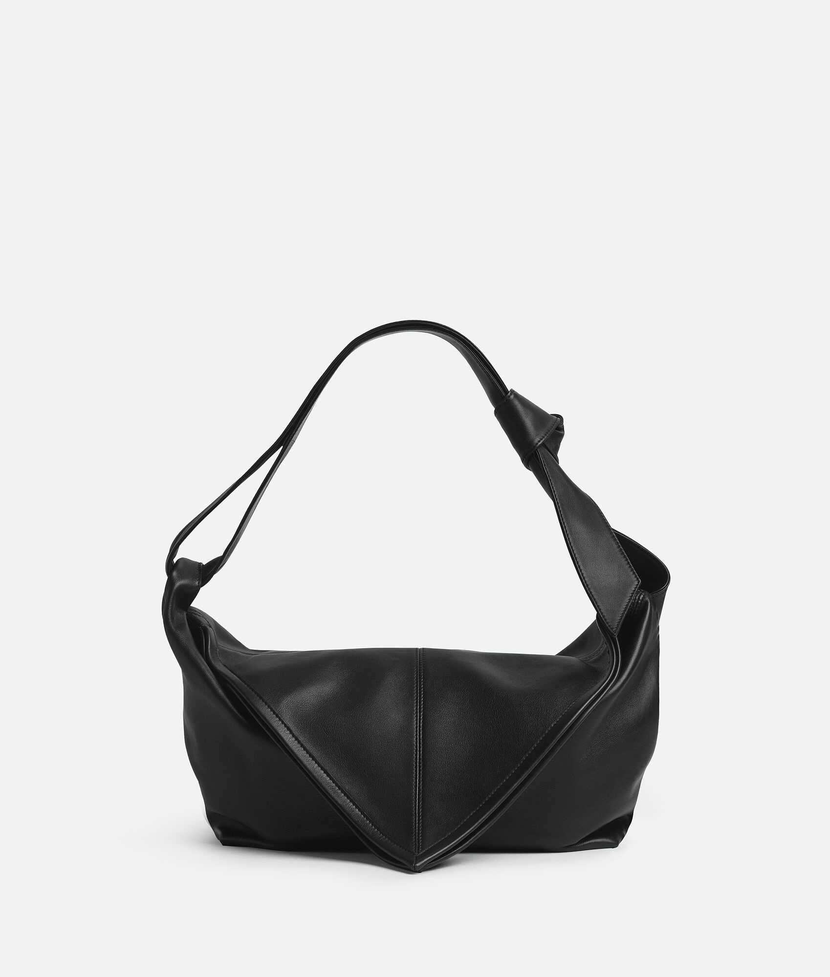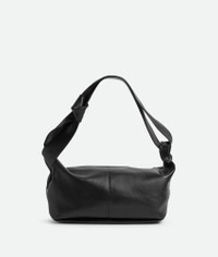 Shoulder bag in silky calf leather with adjustable knot strap. Product Details - Shoulder bag in silky calfskin with adjustable strap and knot detail - One interior open pocket and one key-hook on strap - Flap closure - Material: calfskin - Lining: Suede - Color: Black - Hardware: Silver finish - Height: 22 cm | 8.7" - Width: 32 cm | 12.6" - Depth: 15 cm | 5.9” - Made in: Italy - Product code: 806471V4O908803