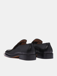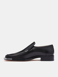 BOTTEGA VENETA loafers in black, paneled calfskin construction, low-cut, slip-on style, square moc-toe, metal tip sole, block heel, logo-embossed footbed & sole, lined. Made in Italy 100% Calfskin Italian Sizing