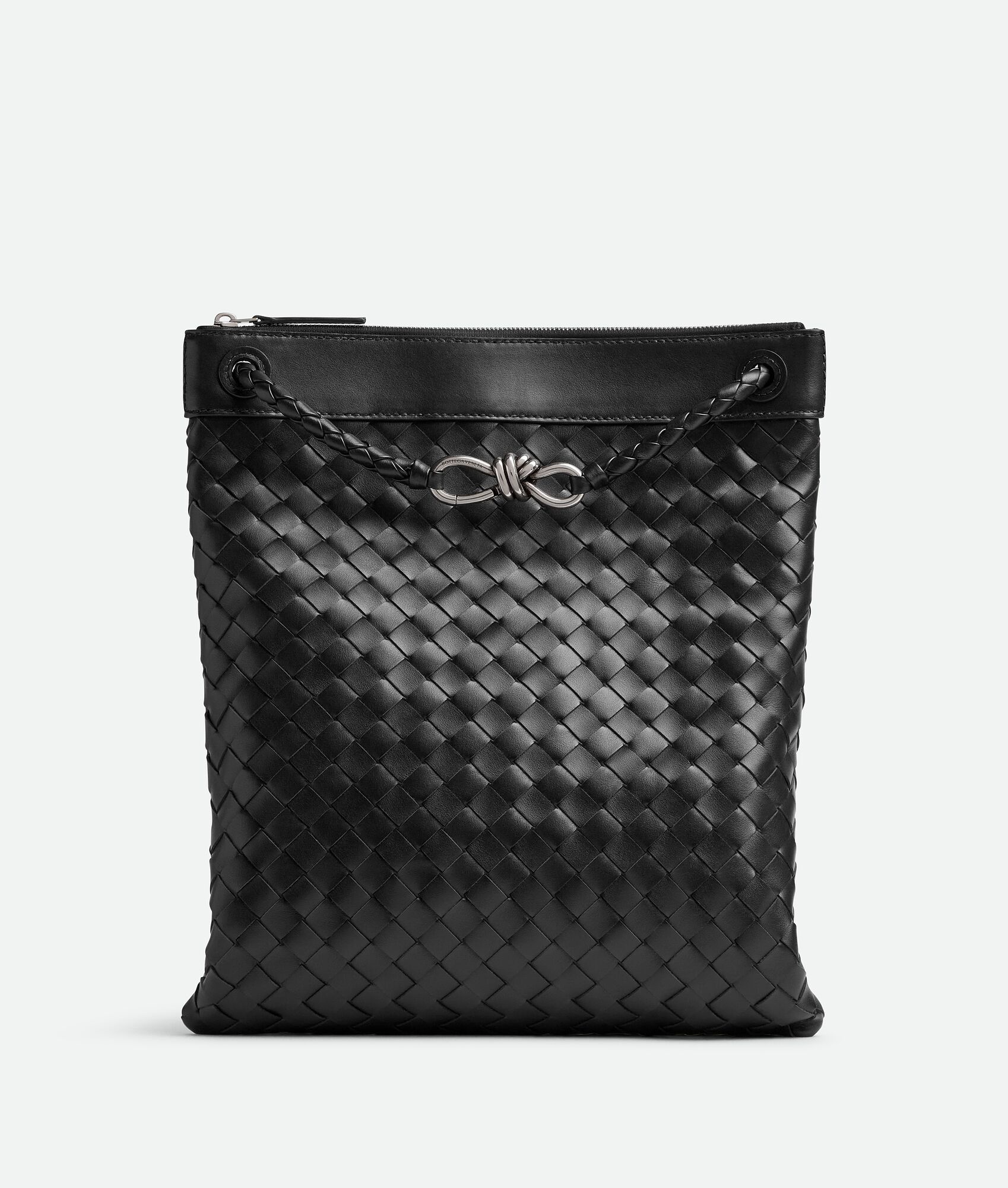 Flat messenger in Intrecciato leather with signature knot detail and cross-body strap. Product Details - Intrecciato leather flat messenger with sliding cross-body strap - Two interior open pockets and one zipped pocket - Zip closure - Material: calfskin - Lining: canvas - Color: Black - Hardware: Vintage Silver finish - Height: 39 cm | 15.4" - Width: 33 cm | 13" - Depth: 2 cm | 0.8" - Strap drop: 50 cm | 19.7” - Made in: Italy - Product code: 806490V2HLD1208