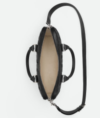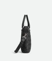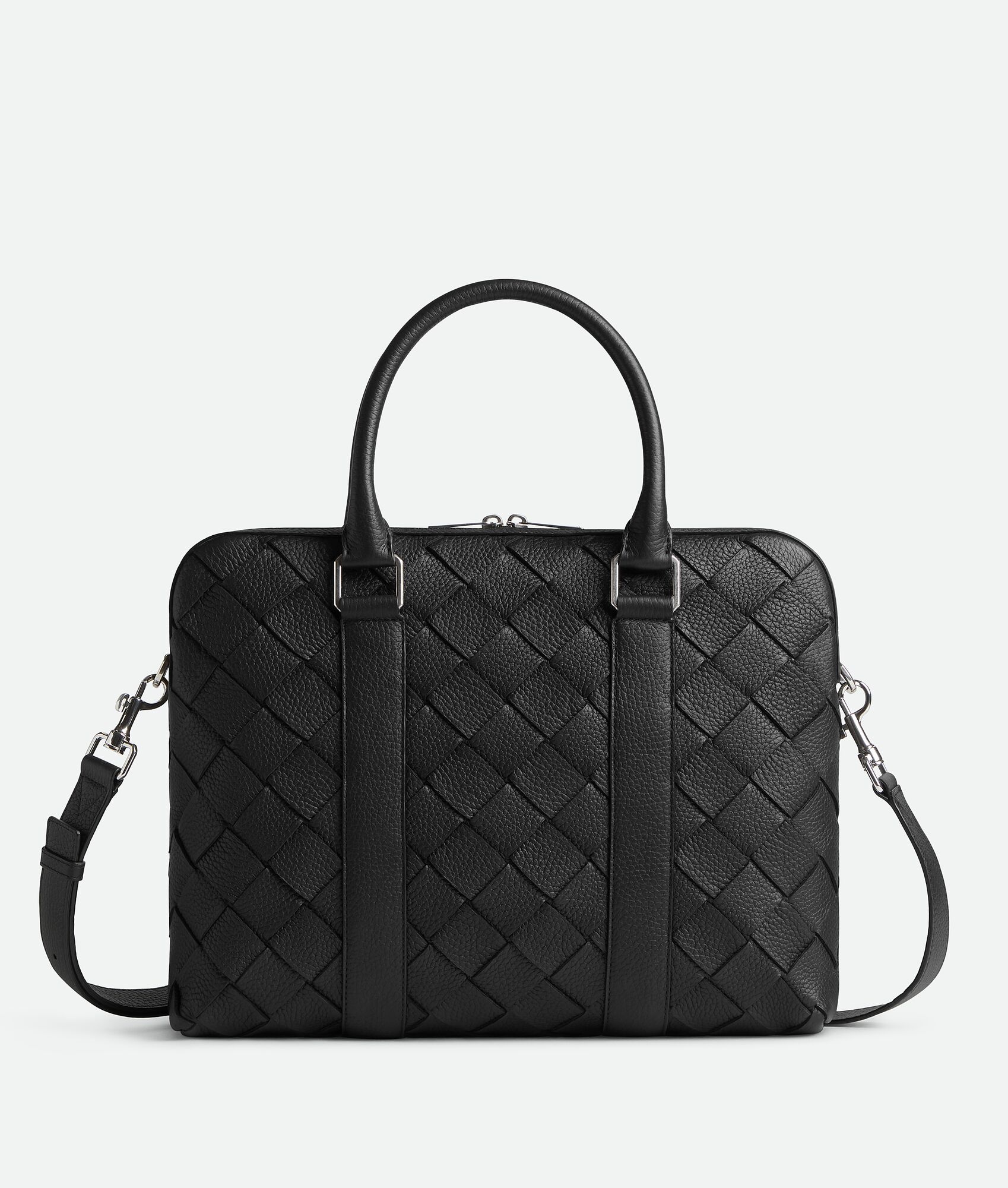 Briefcase in Intrecciato grained leather with adjustable and detachable shoulder Product Details - Small Intrecciato grained leather briefcase with detachable and adjustable shoulder strap - One interior zipped pocket and double open phone pockets - Zip closure - Material: calfskin - Lining: Canvas - Color: Black - Hardware: Silver finish - Height: 28 cm | 11" - Width: 35.5 cm | 14" - Depth: 7.5 cm | 2.6" - Handle drop: 15.5 cm | 6.1" - Strap drop: 55 cm | 21.7" - Made in: Italy - Product code: 799765V4G318803
