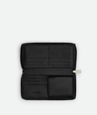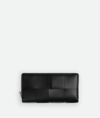 Intreccio leather wallet. Product Details - Intreccio leather wallet - Nine card slots, one note compartment, one additional pocket, one folded coin purse - Zip closure - Material: Calfskin - Lining: Calf leather - Color: Black - Hardware: Silver finish - Height: 9.5 cm I 3.7" - Width: 19 cm I 7.4" - Depth: 2 cm | 0.7" - Made in: Italy - Product code: 708612VBWD28803