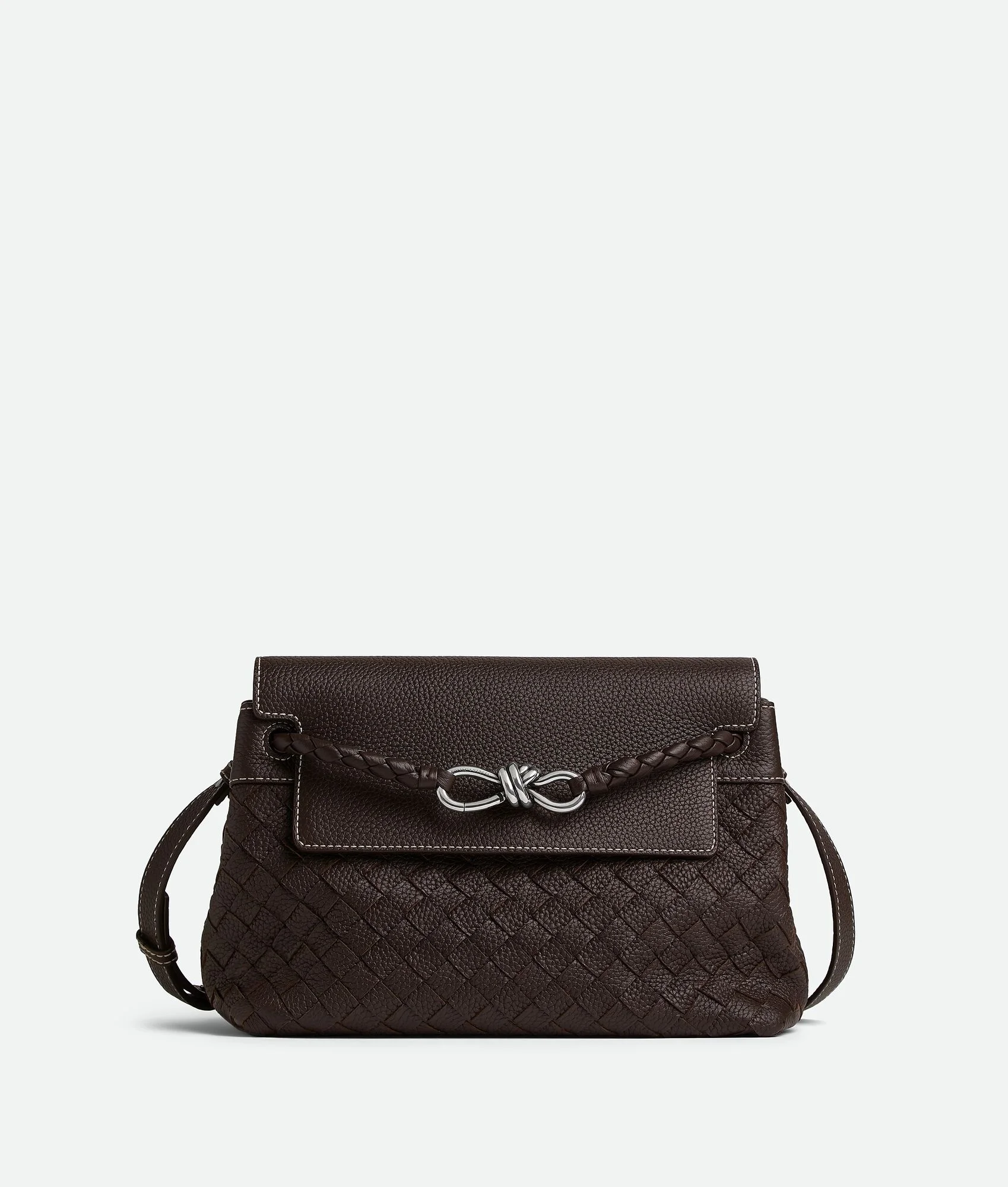 Messenger in grained Intrecciato leather with contrasted stitching and signature Product Details - Intrecciato grained leather small messenger with contrasted stitching - Adjustable and detachable cross-body strap - Two interior flat open pockets and one zipped pocket - Flap closure - Material: Calfskin - Lining: Canvas - Color: Fondant - Hardware: Vintage Silver finish - Height: 20 cm | 7.1" - Width: 29 cm | 11.4" - Depth: 13 cm | 5.1" - Strap drop: 58 cm | 22.8" - Made in: Italy - Product code: 815781V53N22180